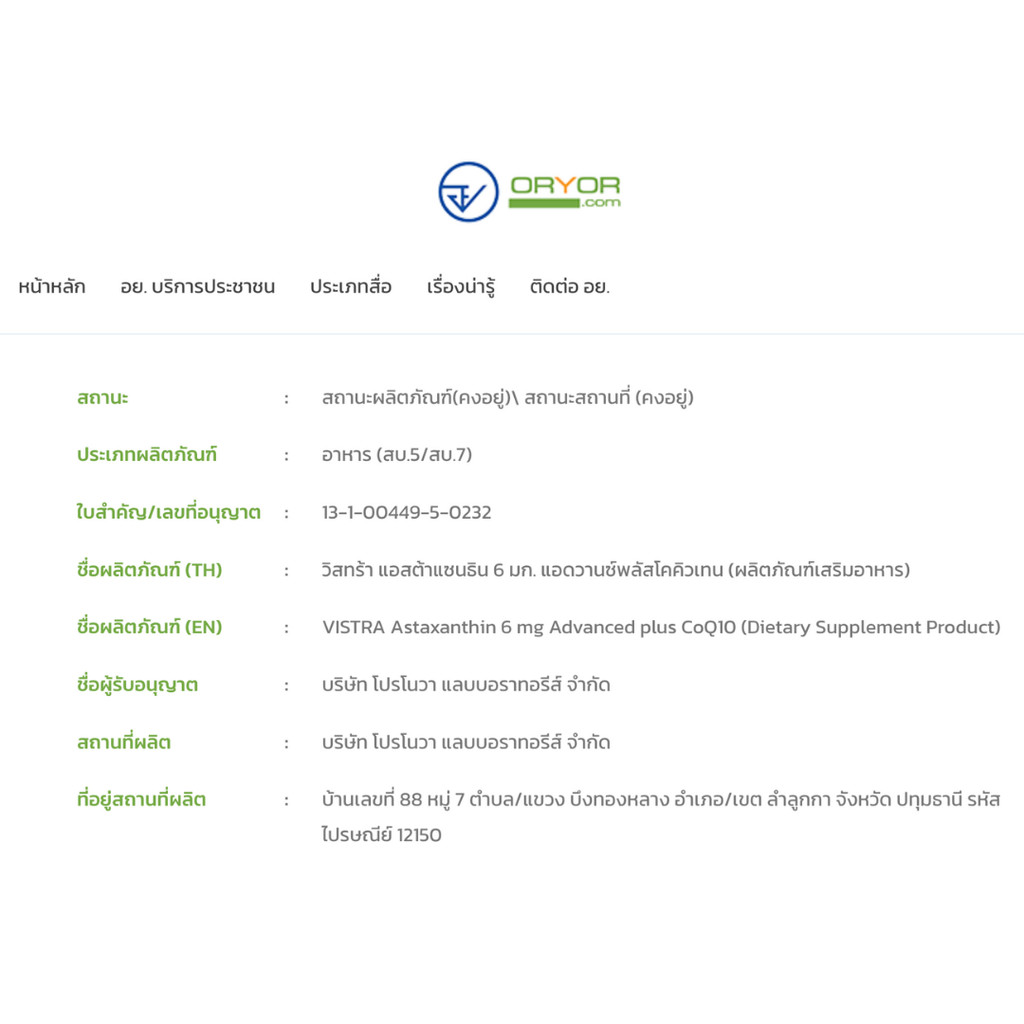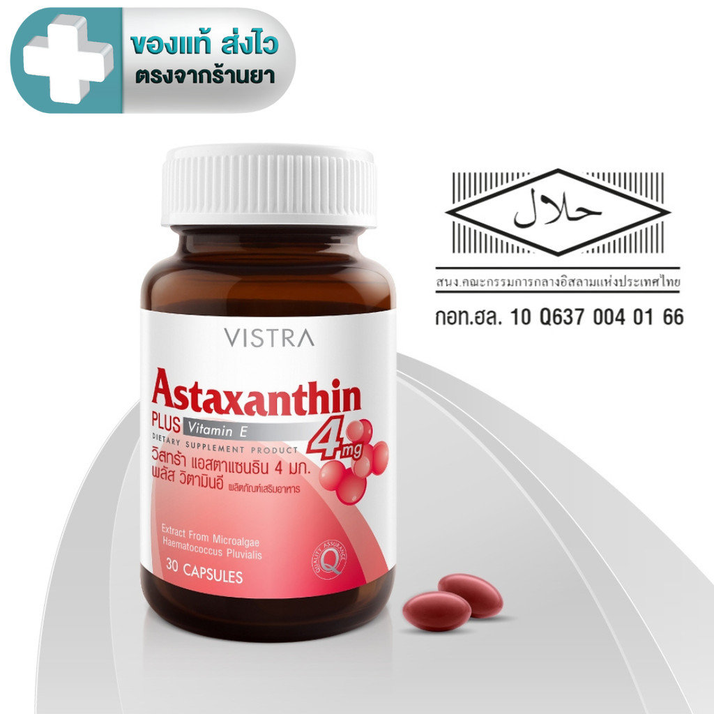 Vistra Astaxanthin Plus Vitamin E วิสทร้า แอสตาแซนธิน (4 mg. / 6 mg.) วิสทร้า พลัสวิตามินอี ขนาด (30 แคปซูล) [Pcare]