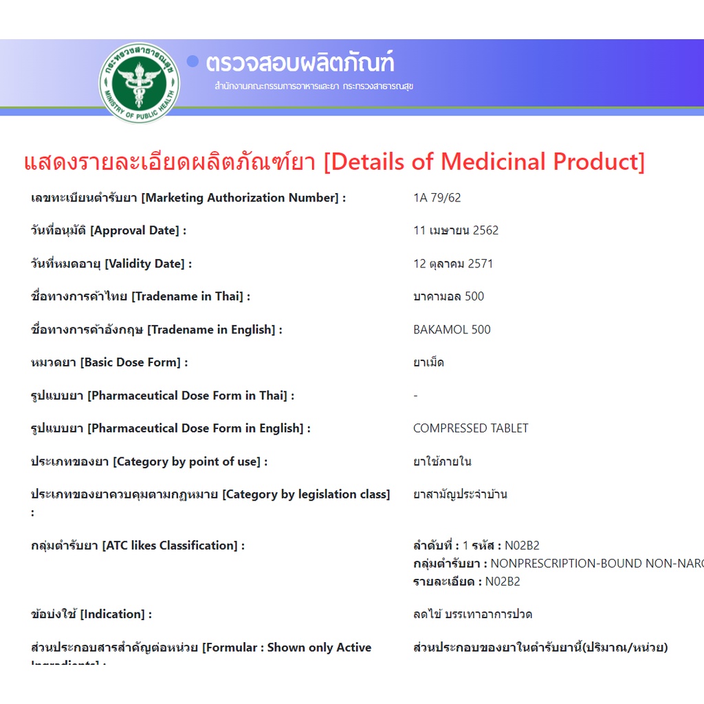 Bakamol 500 บาคามอล 500 ยาเม็ด บรรเทาปวด ลดไข้ พาราเซตามอล 500 มิลลิกรัม ยาสามัญประจำบ้าน 1แผง 20394