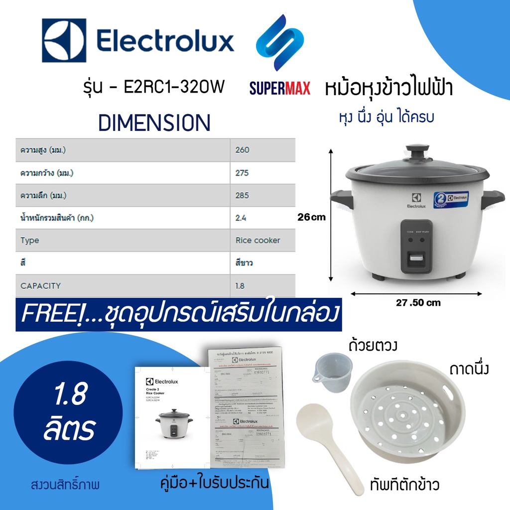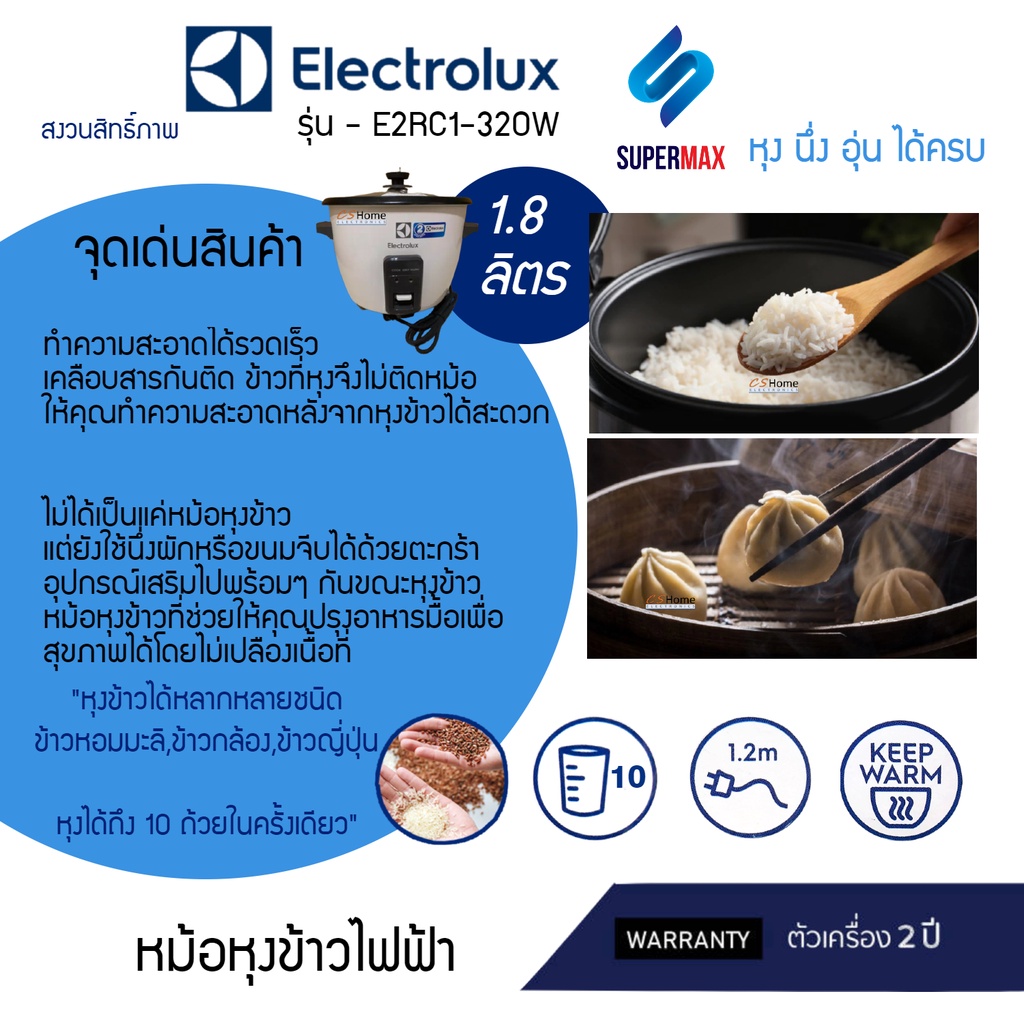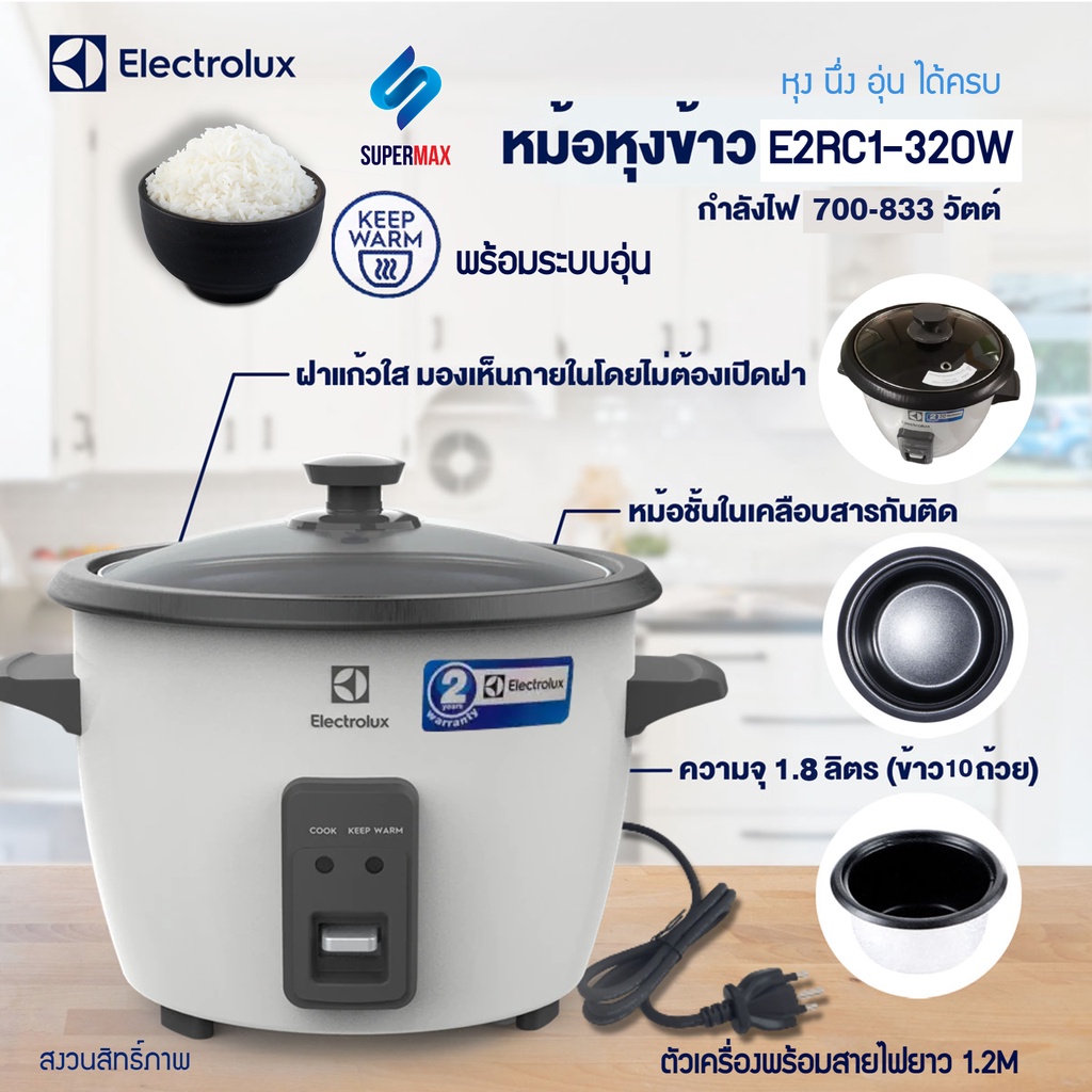 ELECTROLUX หม้อหุงข้าวฝาแก้ว E2RC1-320W ขนาด 1.8 ลิตร ตัวหม้อชั้นในหนา 1.0 มิลลิเมตร เคลือบสารกันติด รับประกันสินค้า 2ป