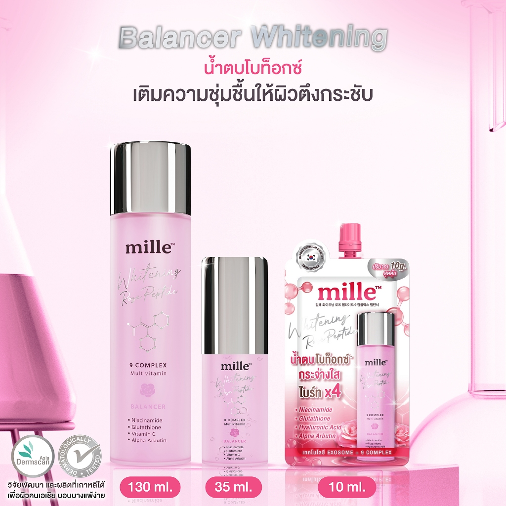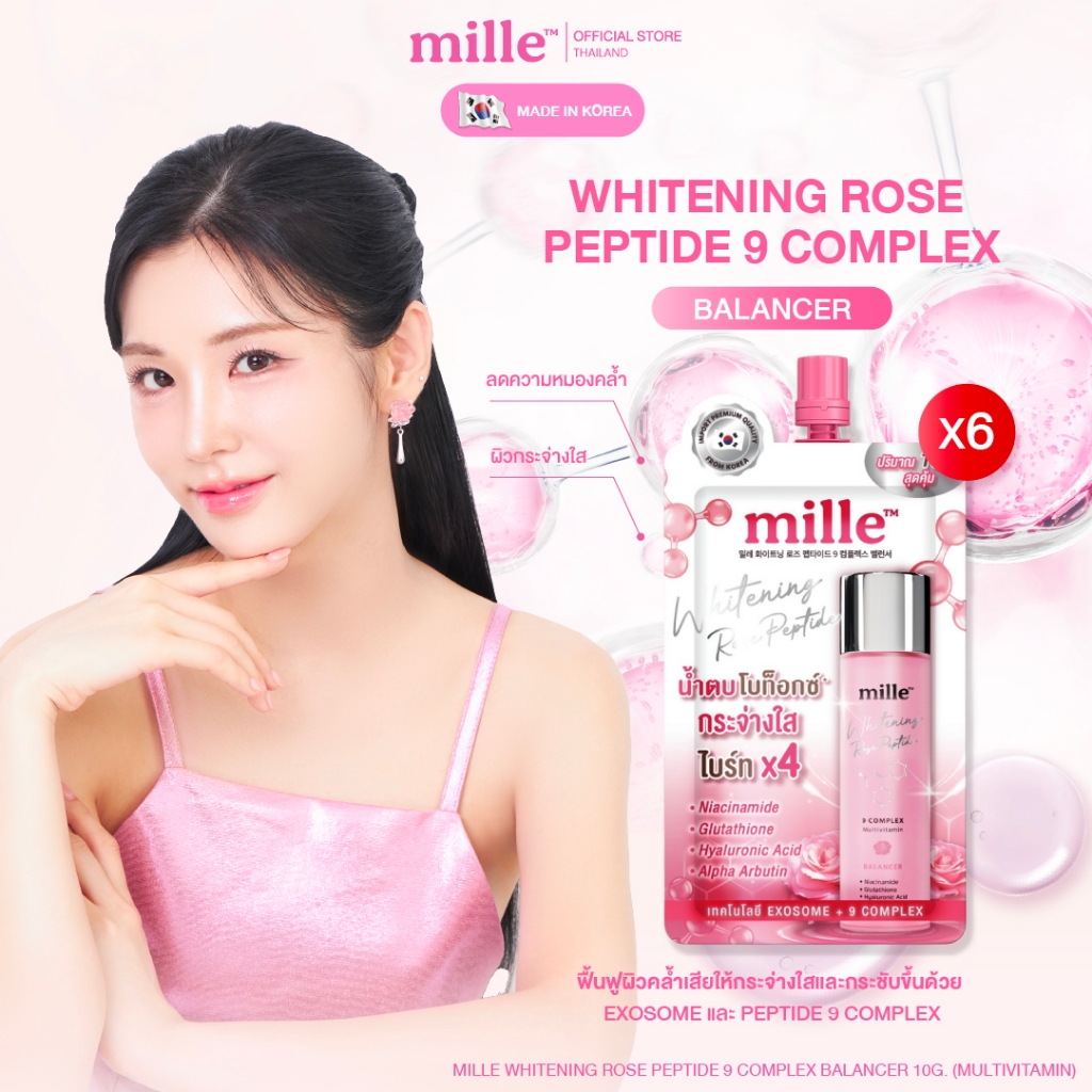 [6 ซอง] MILLE น้ำตบโรสเปปไทด์ WHITENING ROSE PEPTIDE 9 COMPLEX BALANCER 10ml. มิลเล่ น้ำตบ บ าลานเซอร์ ล็อคความชุ่มชื้น