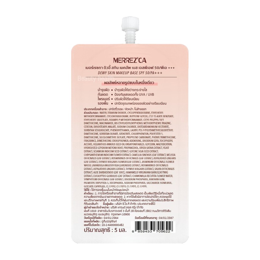 Merrezca dewy skin makeup base SPF 50/PA+++ 4 in 1 เบส รองพื้น ไพรเมอร์ บำรุง ในซองเดียว เนื้อครีมปรับตามสีผิว (5 ml.)
