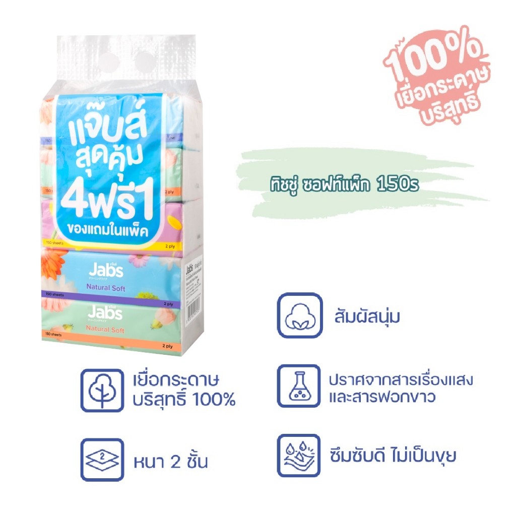 ซื้อ 1 บาท ลูกค้าใหม่ Jabs แจ๊บส์ ทิชชู ่ซอฟท์แพ็ค 2ชั้น 150และ230 แผ่น 1หิ้ว และ1ห่อ, แจ็กซ์ (Jaxx)100แผ่น 12ห่อ