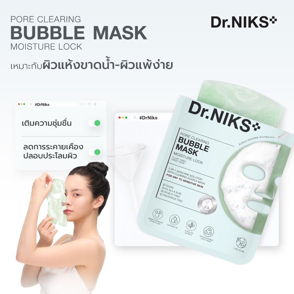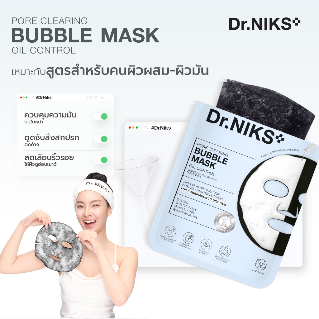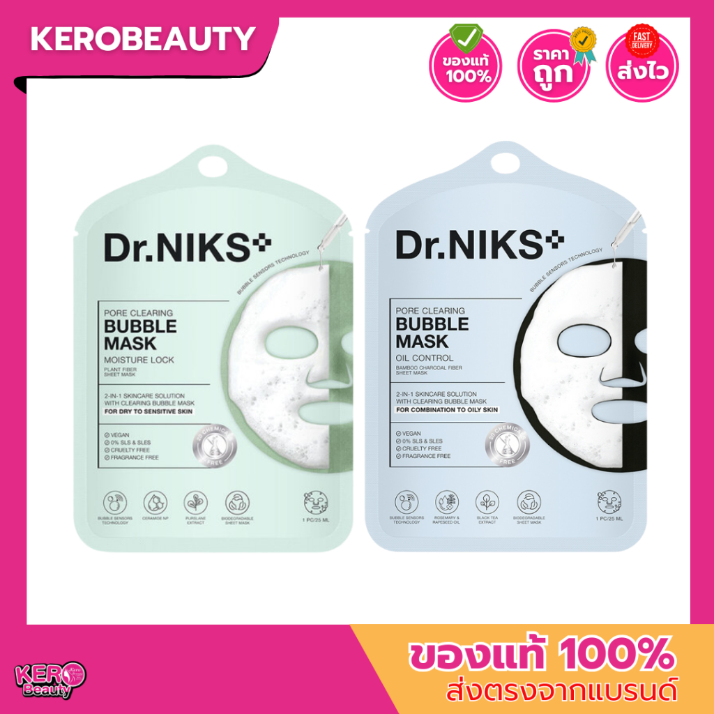 (แบบแผ่น) Dr.NIKS พอร์เคลียริ่งบับเบิ้ลมาสก์ 25ml ดร.นิกส์ #มาสก์ฟองล้างหน้า 2 สูตร 2in1 ดูดซับสิ่งสกปรก พร้อมบำรุง