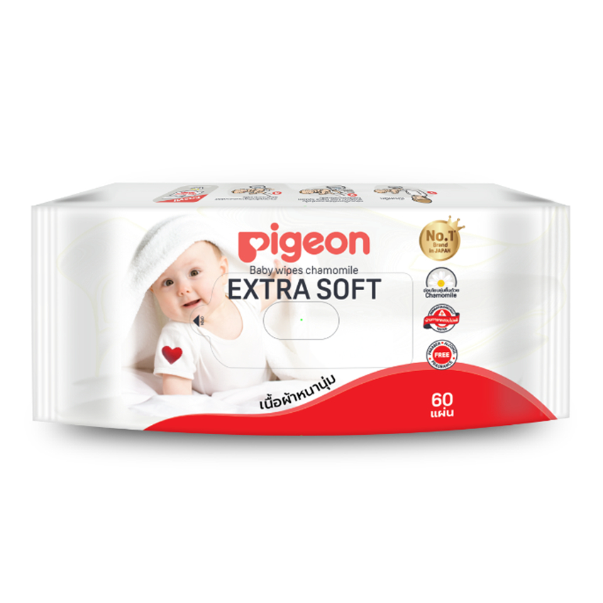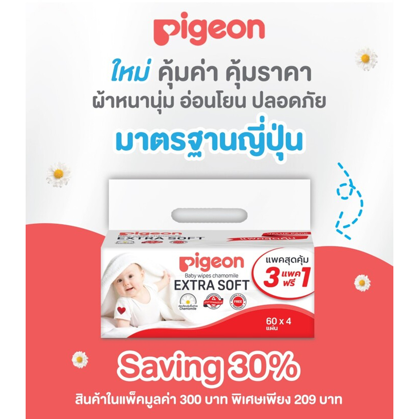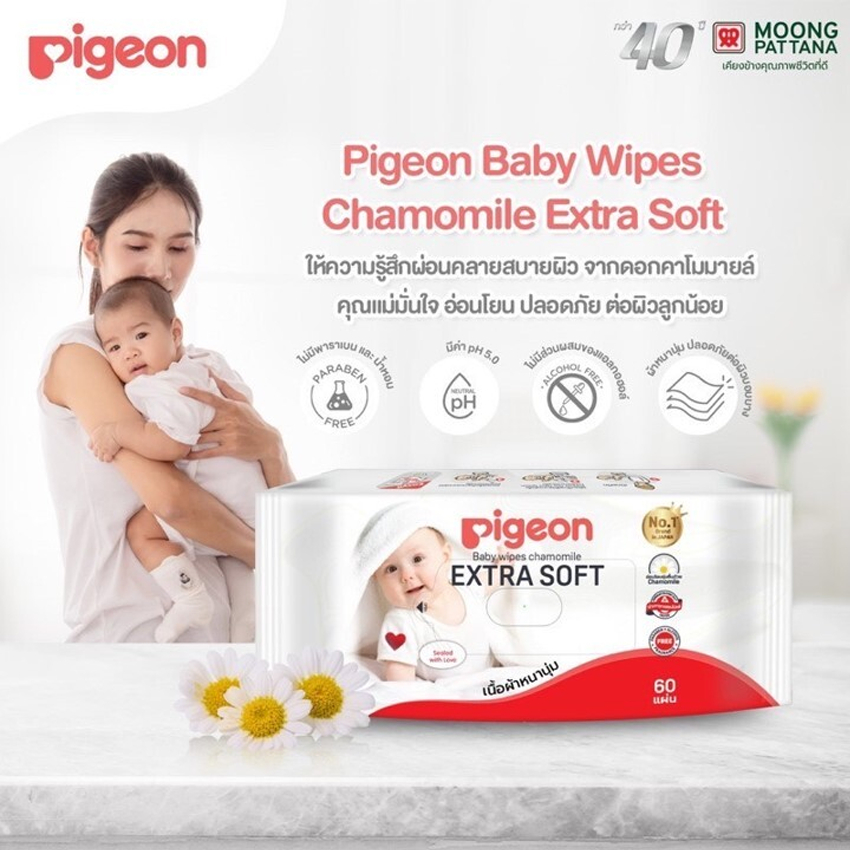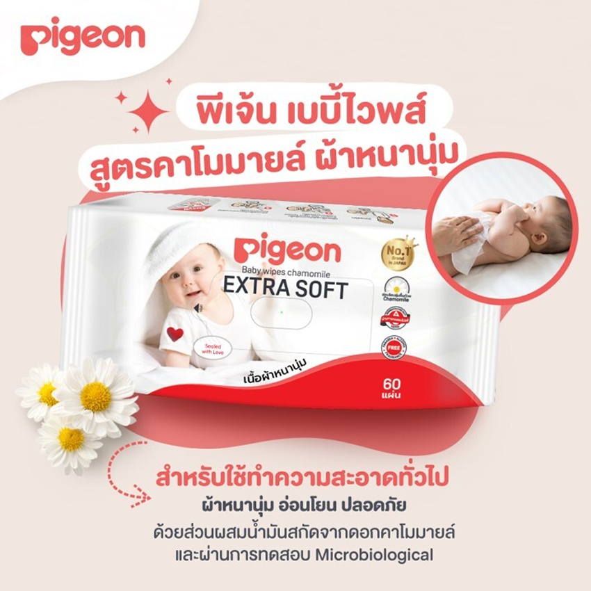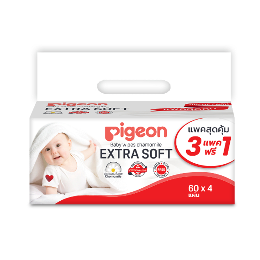 พีเจ้น เบบี้ไวพส์ กระดาษเย็น สูตรคาโมมายล์ ผ้าหนานุ่ม ห่อล่ะ 60 แผ่น แพ็ค 3+1 ห่อ PIGEON BABY WIPES CHAMOMILE 60 SHEETS