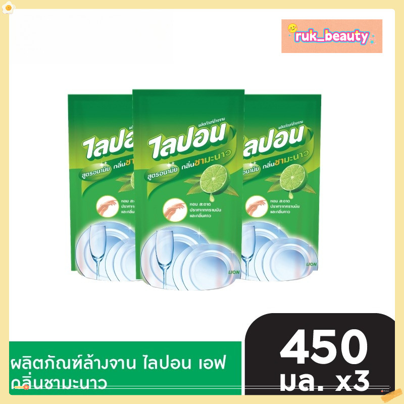 Lipon F น้ำยาล้างจาน ไลปอน กลิ่นชามะนาว ขจัดคราบมัน (ชนิดเติม) 450 ml แพ็ค 3 LIONSOS