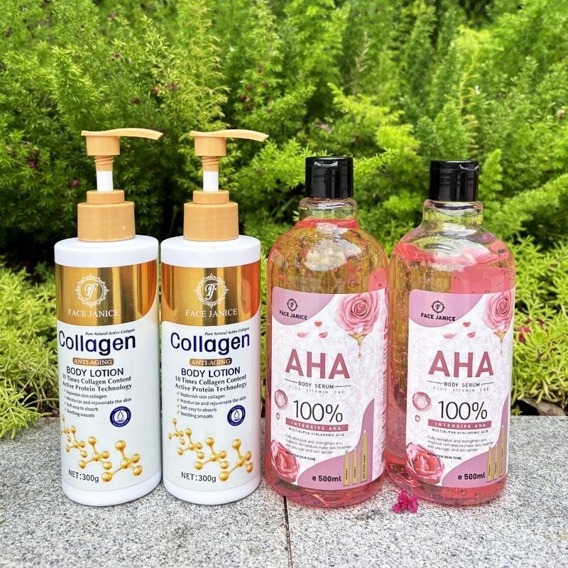 【2 แถม 2】AHA เซรั่มบำรุงผิวกายกุหลาบ100% 500ml Body serum + FACE JANICE โลชั่นคอลลาเจนทองคำ โลชั่นผิวขาว 300ml