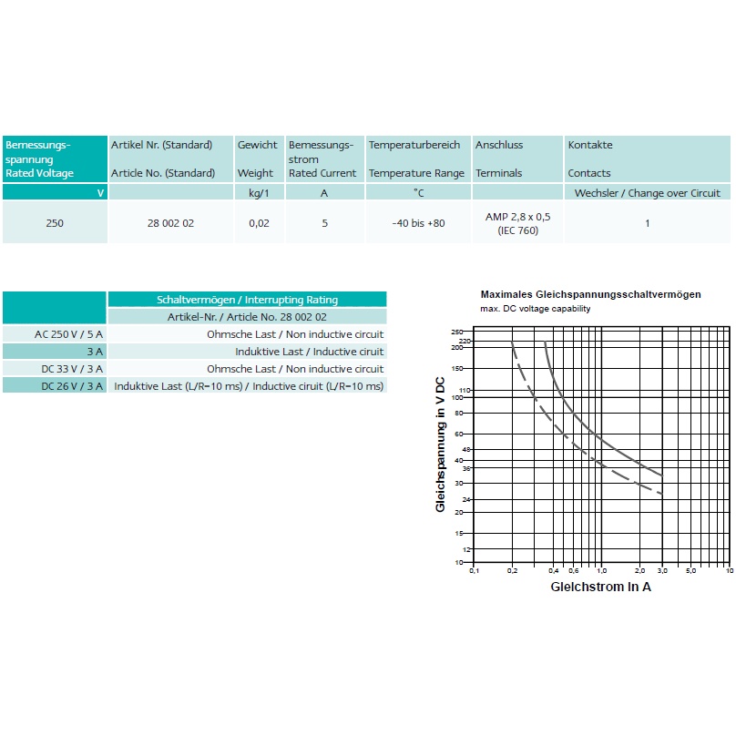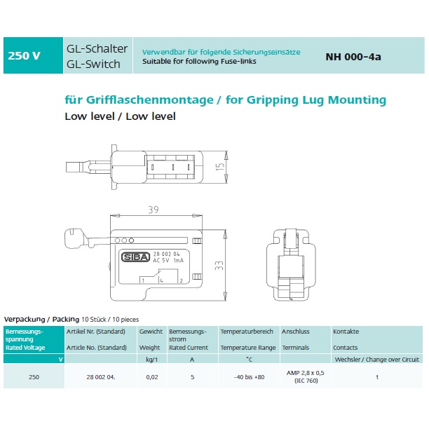 Microswitch for HRC Fuse Link Size 00 - 4a SIBA Auxiliary Switch AC 250V 5A 1Change Over Contact 2800202