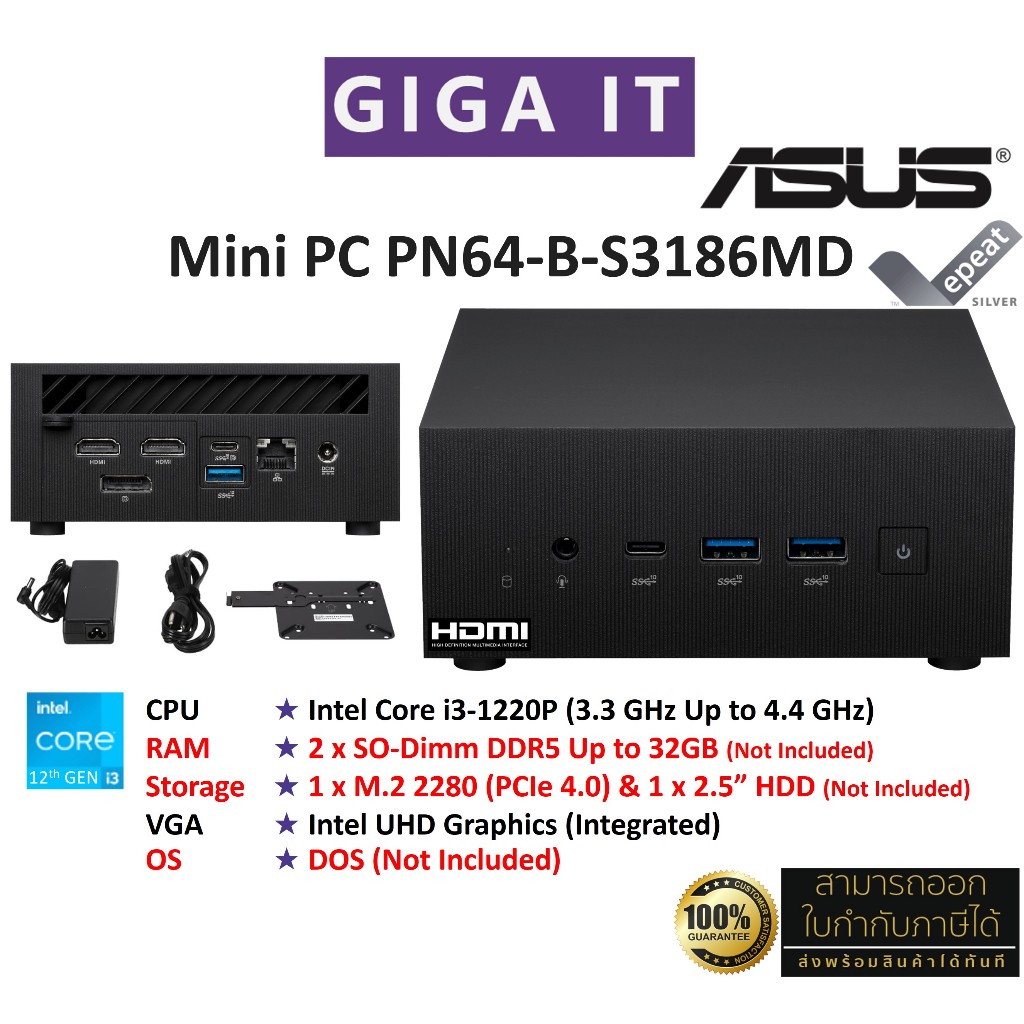 ASUS Mini PC PN64-B-S3186MD_BareBone (Intel Core i3 Gen12, No RAM, No HDD, No OS) ประกันศูนย์ ASUS 3 ปี