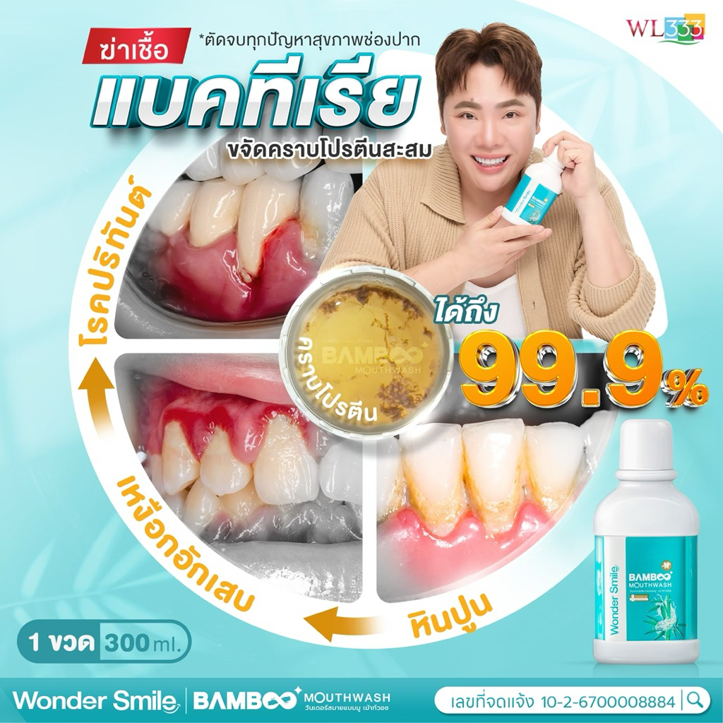 2 แถม 1 Wonder Smile Bamboo Mouthwash 300 ml. น้ำยาบ้วนปาก วันเดอร์ สไมล์ ไม่แสบปาก ไม่มีแอลกอฮอล์