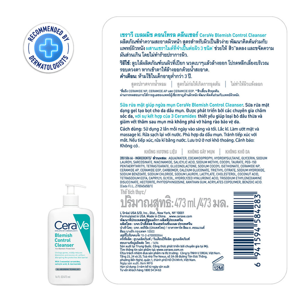 Cerave เซราวี เบลมมิช คลีนเซอร์ 473 มล. ผลิตภัณฑ์ทำความสะอาดผิวหน้าสำหรับผิวที่เป็นสิว
