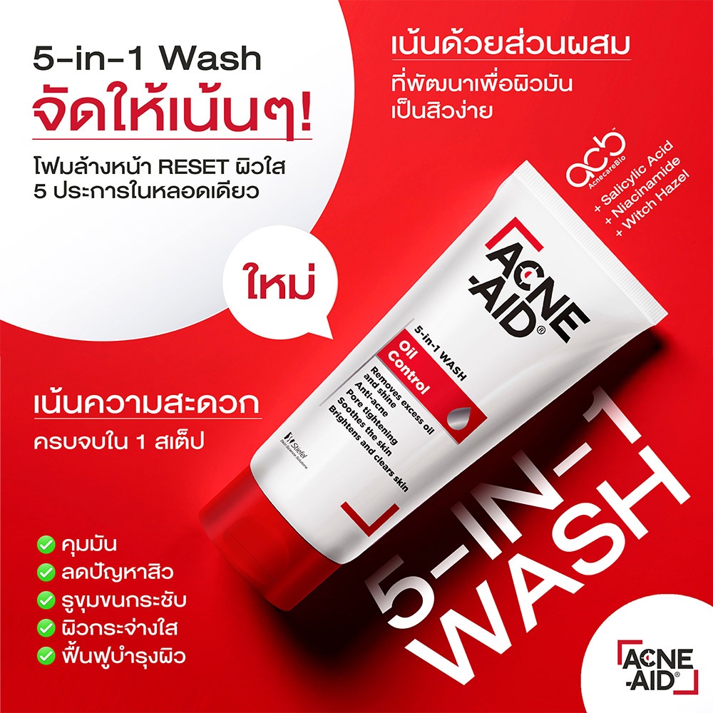 Acne Aid 5in1 Wash Oil Control แอคเน่ เอด 5อิน1 วอช ออยล์ คอลโทรล [100 ml.] เนื้อครีม ล้างหน้า หน้ามัน เป็นสิวง่าย