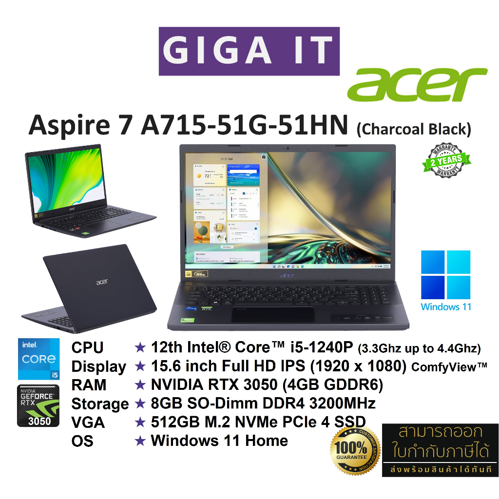 Acer Aspire 7 A715-51G-51HN (15.6" FHD, i5-1240P, 8GB, RTX 3050, 512GฺB M.2, Win11) Charcoal Black ประกันศูนย์ 2 ปี