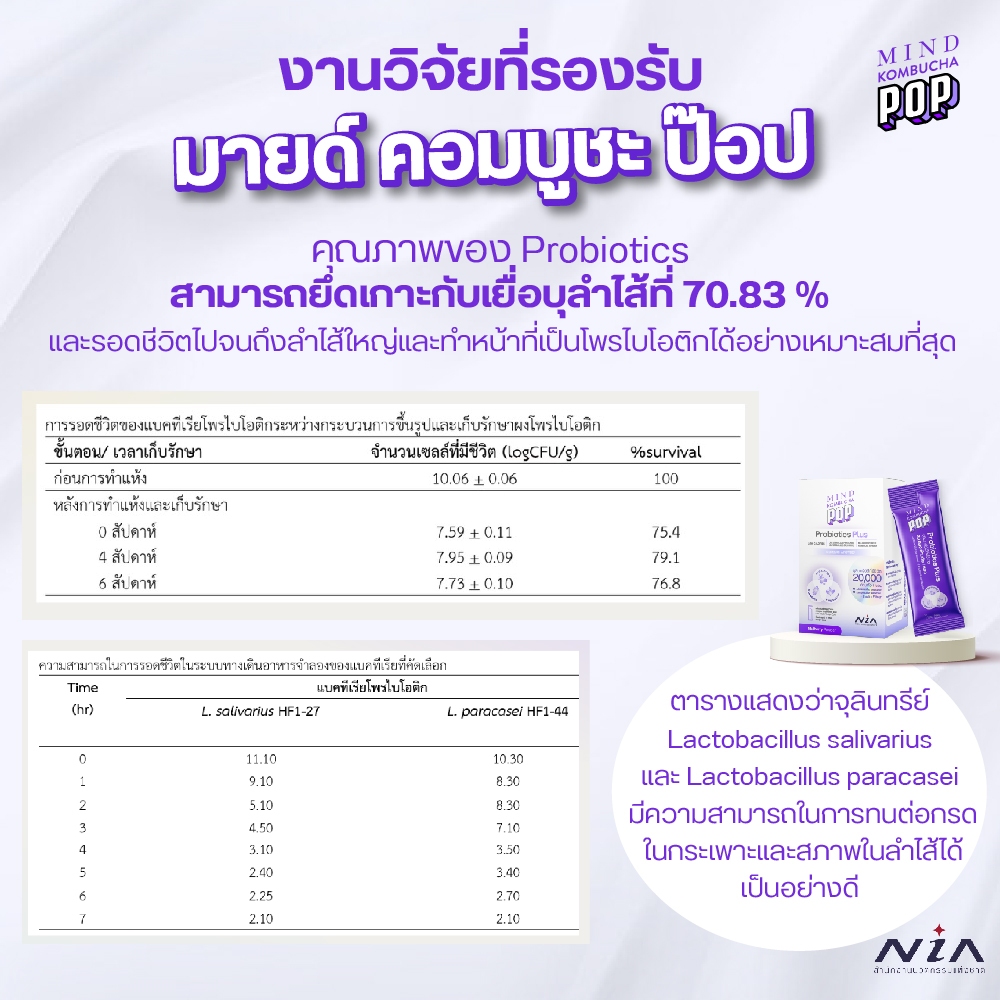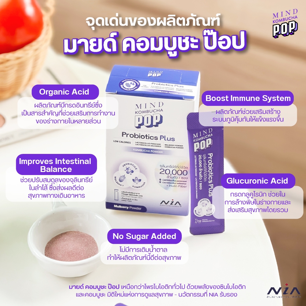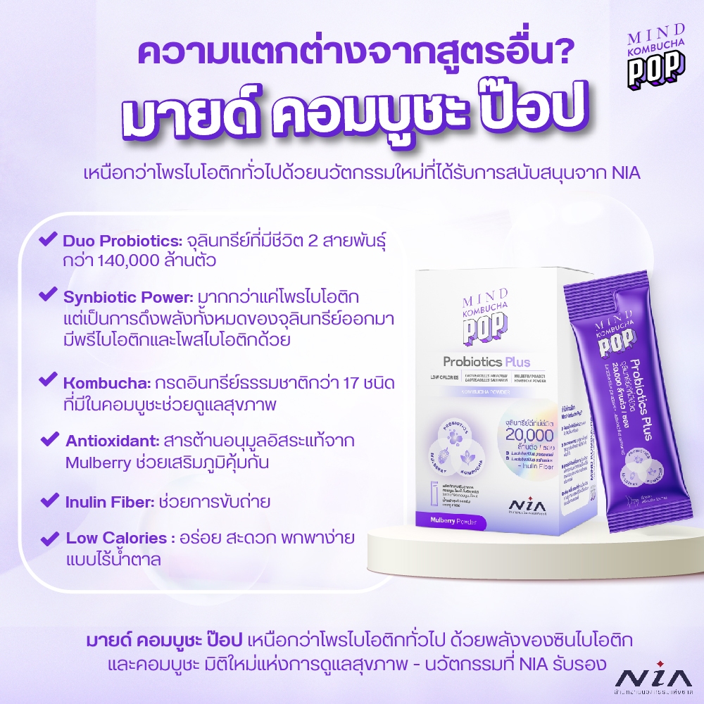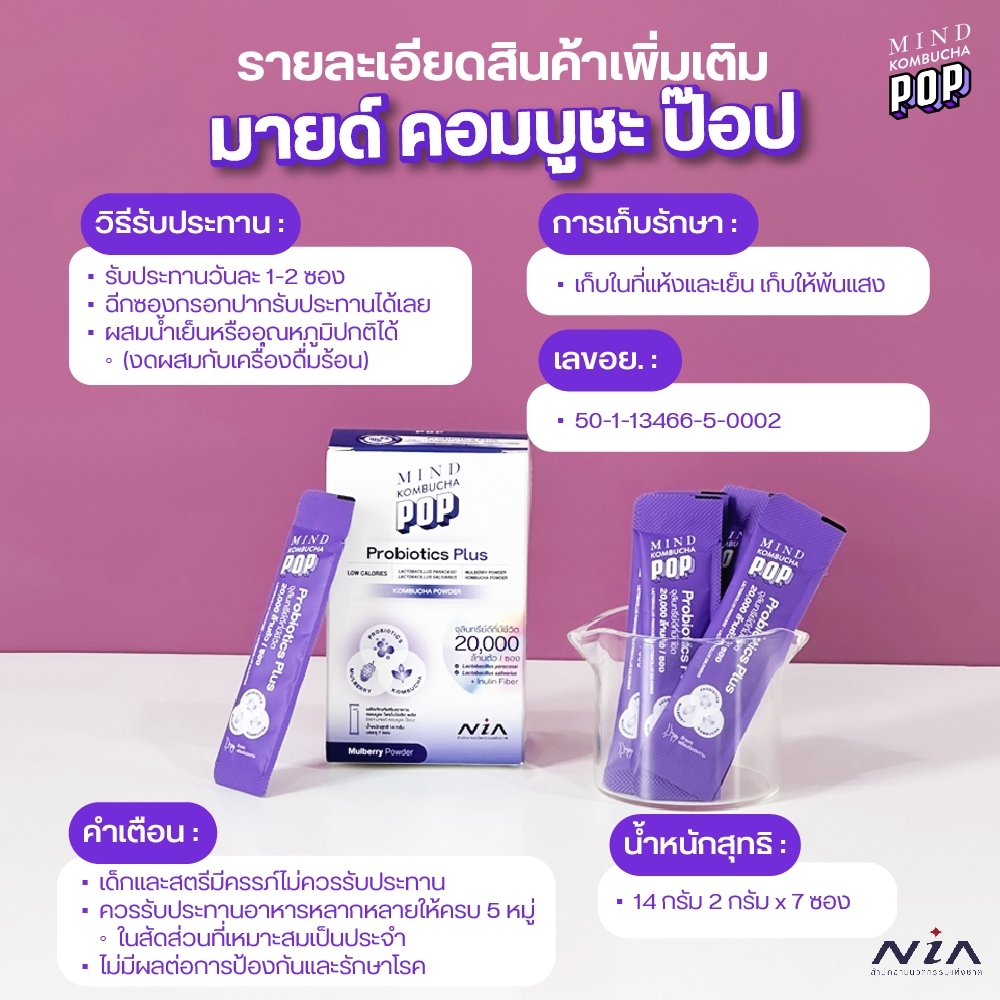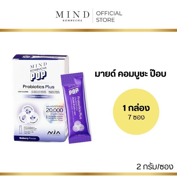 Mind Kombucha POP โพรไบโอติก ซินไบโอติกพลัสคอมบูชะ รับรองโดย NIA จุลินทรีย์ 2 สายพันธุ์ กว่า 20,000 ล้านตัว[1กล่อง7ซอง]