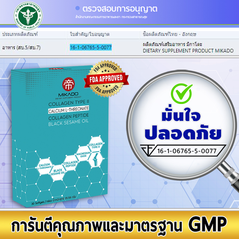 บรรเทาอาการปวดเข่า เพิ่มมวลกระดูก แคลเซียมแอลทรีโอเนต Mikado Collagen Type II Calcium L-Threonate และ น้ำมันงาดำ