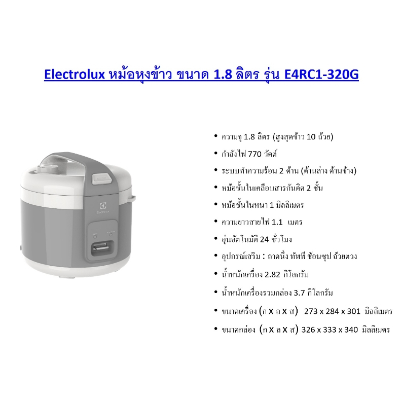 ( มีสินค้า ส่งเลย )ELECTROLUX หม้อหุงข้าว 1.8 ลิตร เทา Electrolux E4RC1-320G