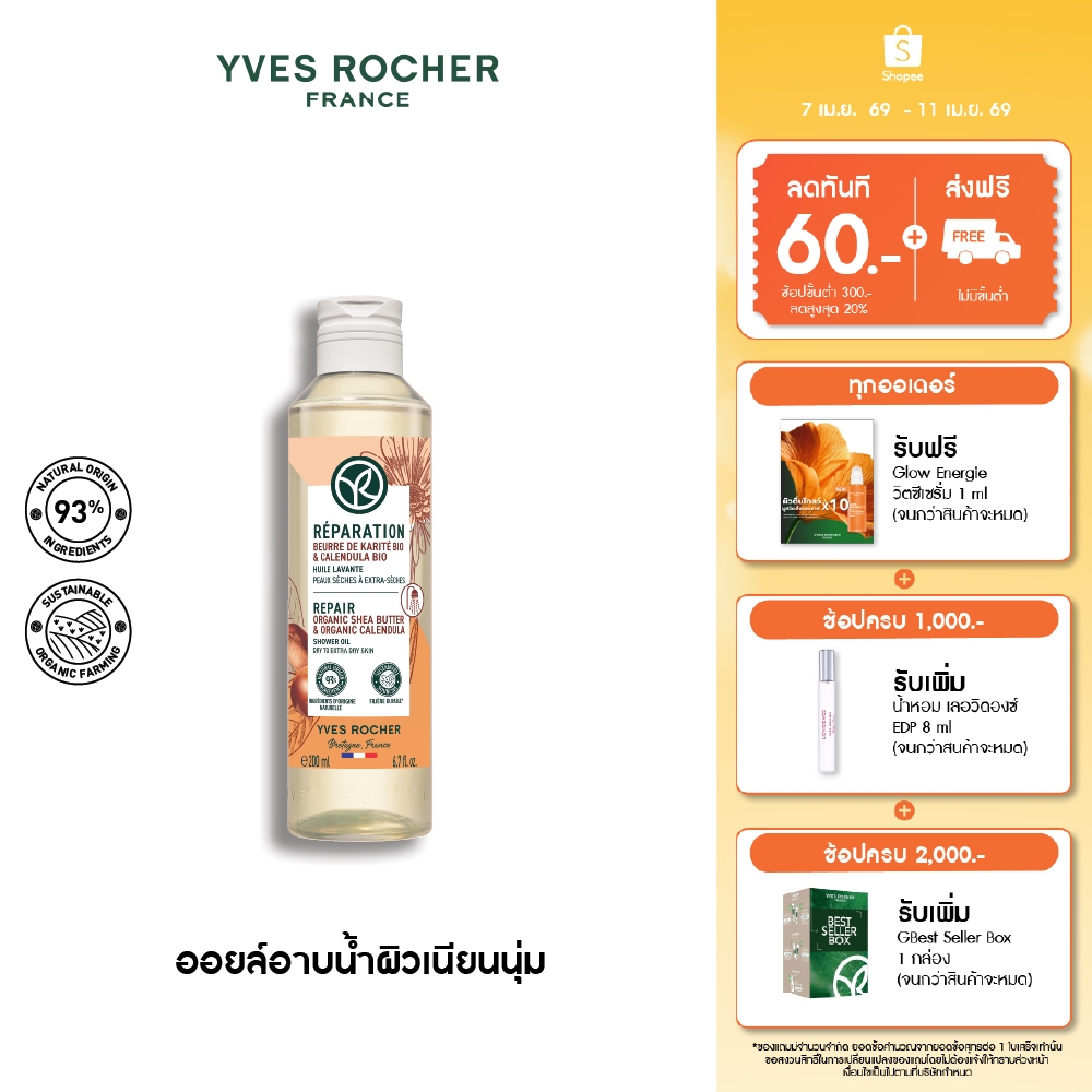 อีฟ โรเช Yves Rocher REPAIR ORGANIC SHEA BUTTER & CALENDULA SHOWER OIL 200ML - ออยล์ทำความสะอาดผิว บำรุงผิวเนียนนุ่มชุ่ม