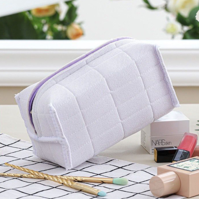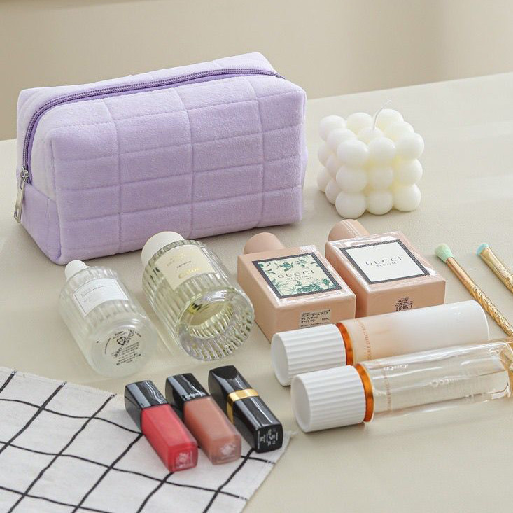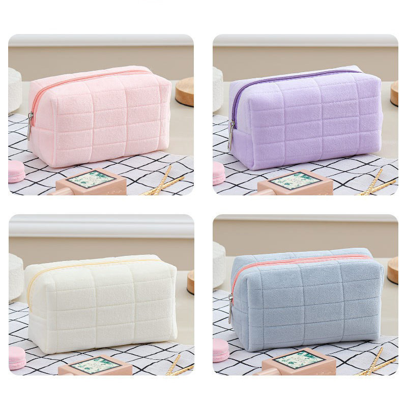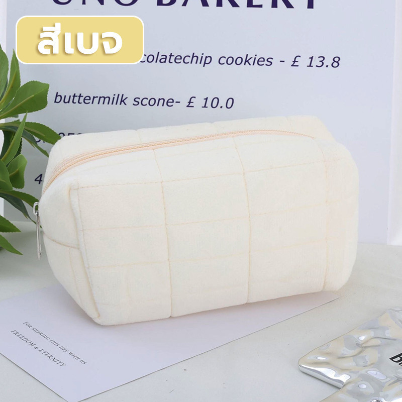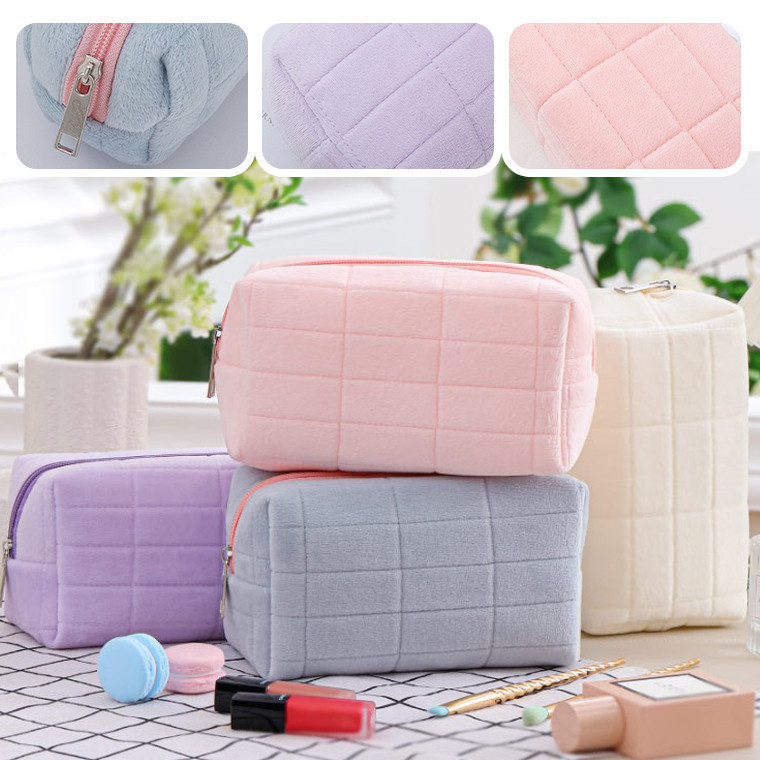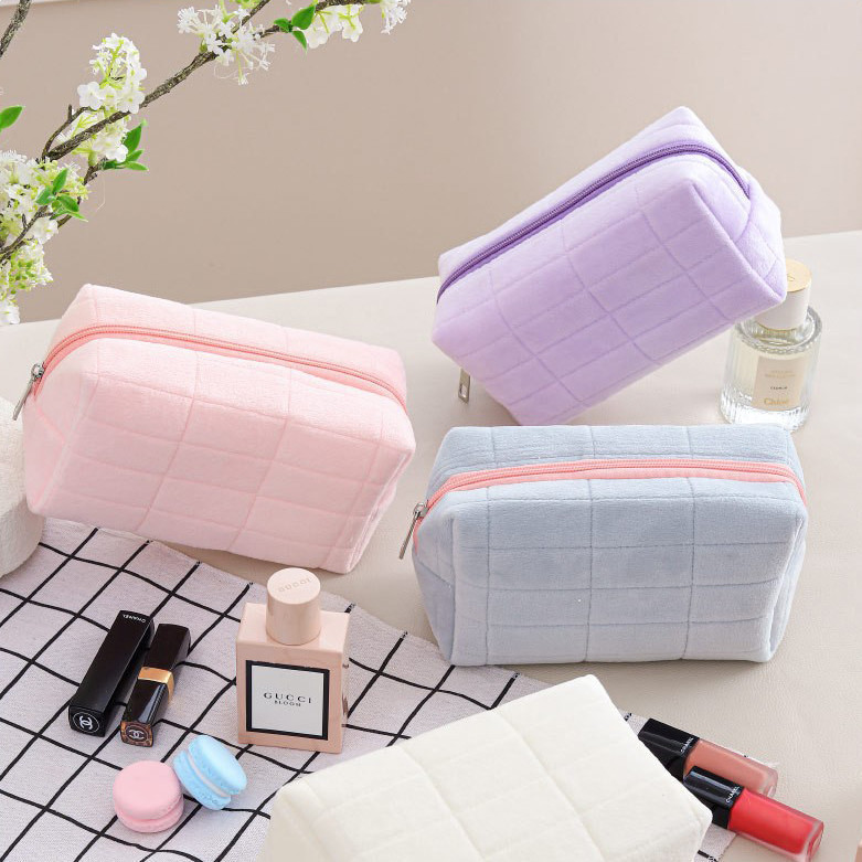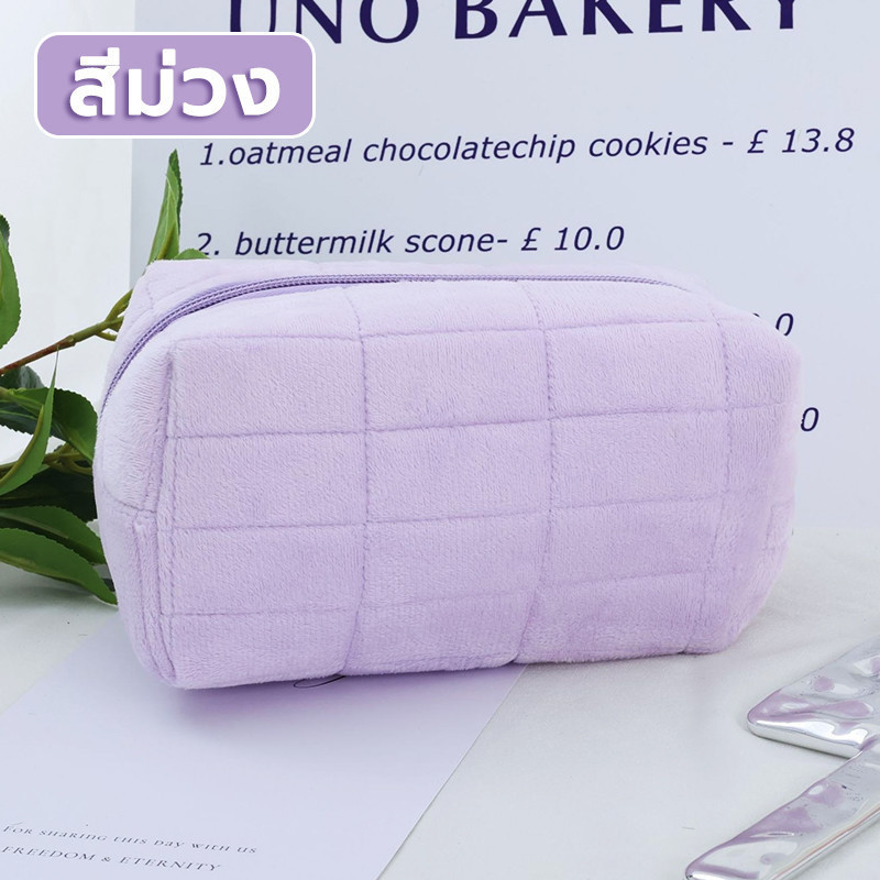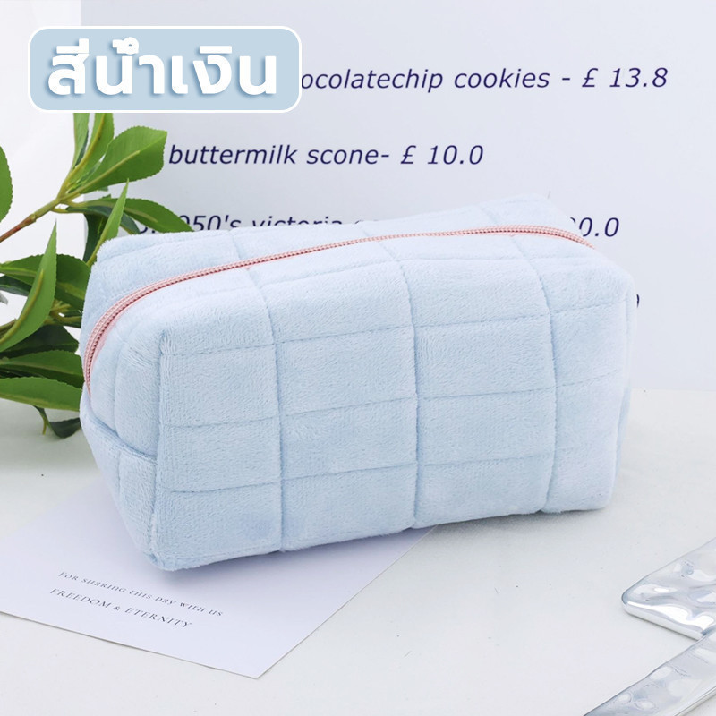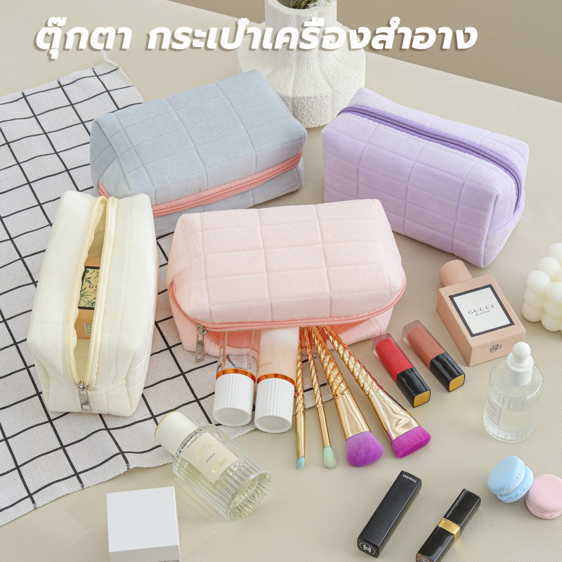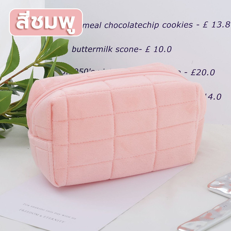 กระเป๋าเครื่องสําอาง กระเป๋าดินสอ สีมาการอง จุของได้เยอะ ผ้ากํามะหยี่ แบบนิ่ม ลายตาราง