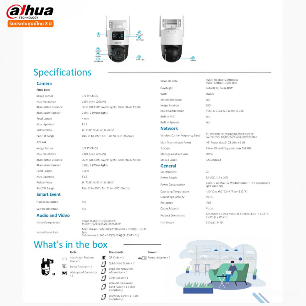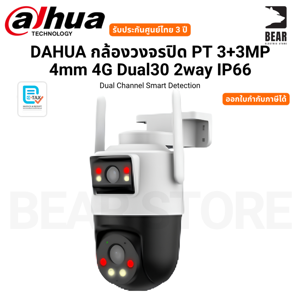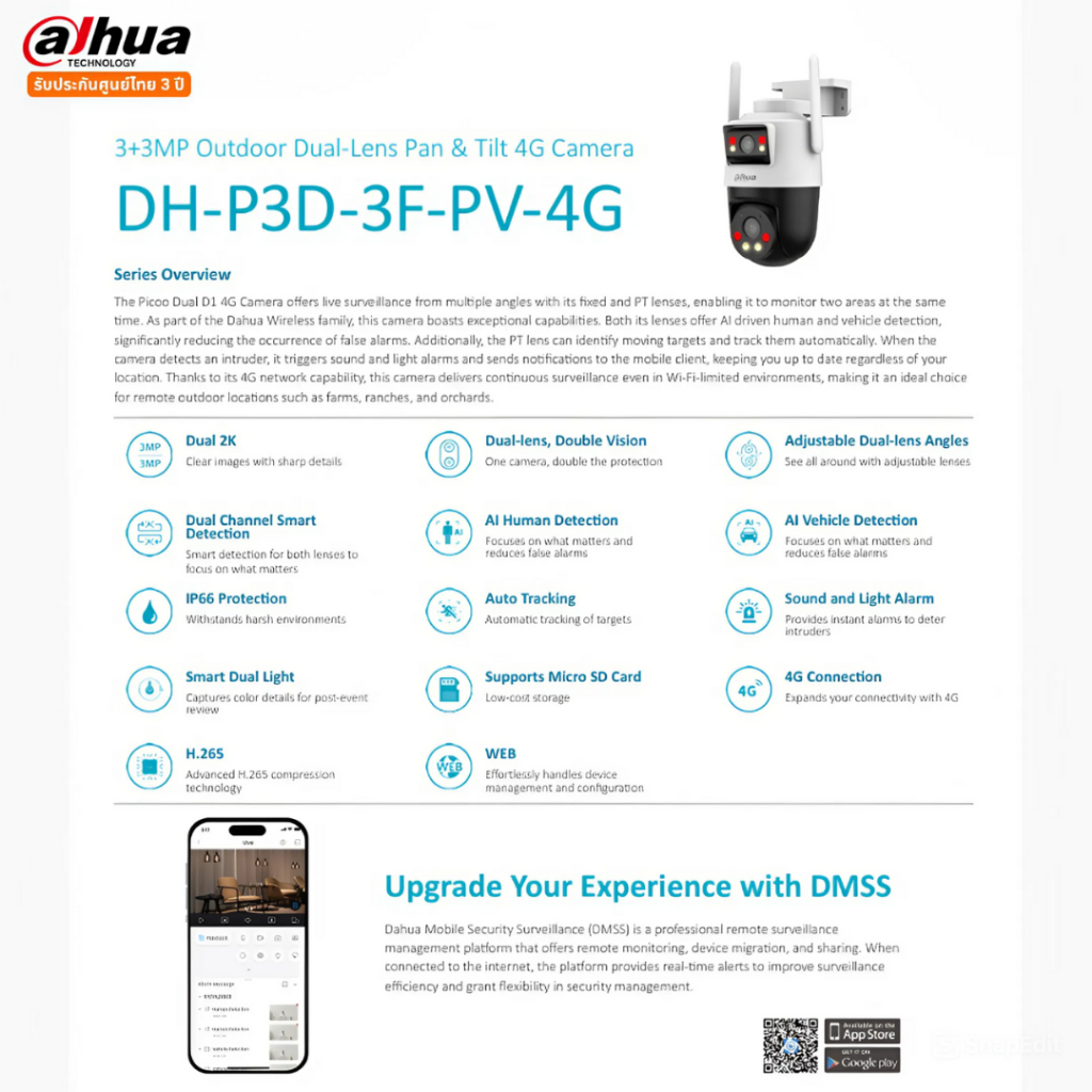 DAHUA กล้องวงจรปิด PT 3+3MP 4mm 4G Dual30 2way IP66 Dual Channel Smart Detection รับประกันศูนย์ไทย 3 ปี