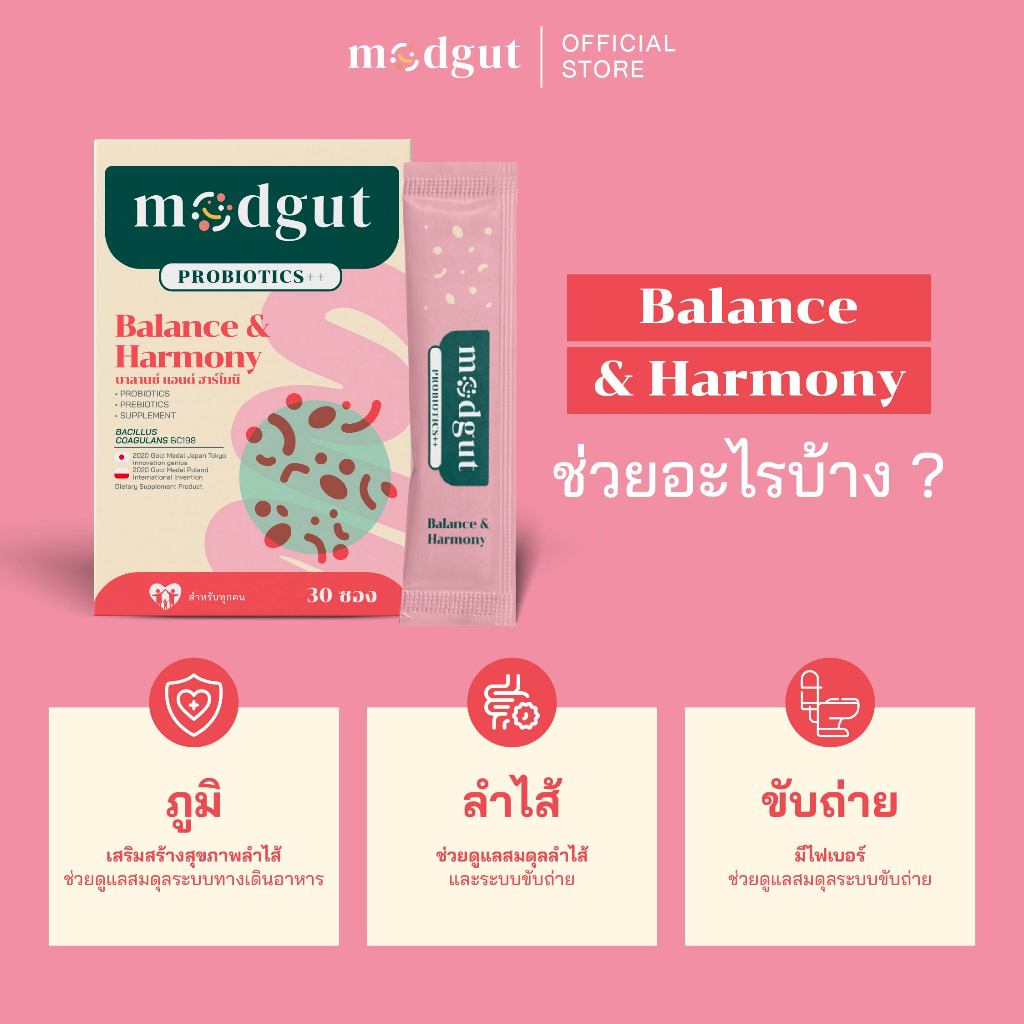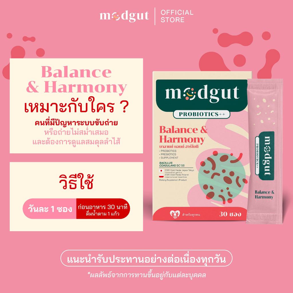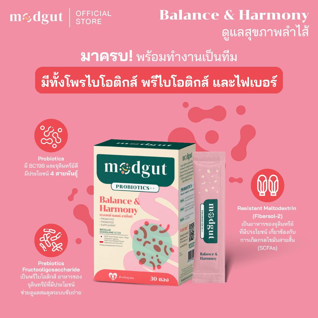 Modgut โพรไบโอติก Probiotics++ สูตร Balance & Harmony สำหรับท้องผูก ช่วยสมดุลลำไส้ 30 ซอง ทานได้ทุกวัน