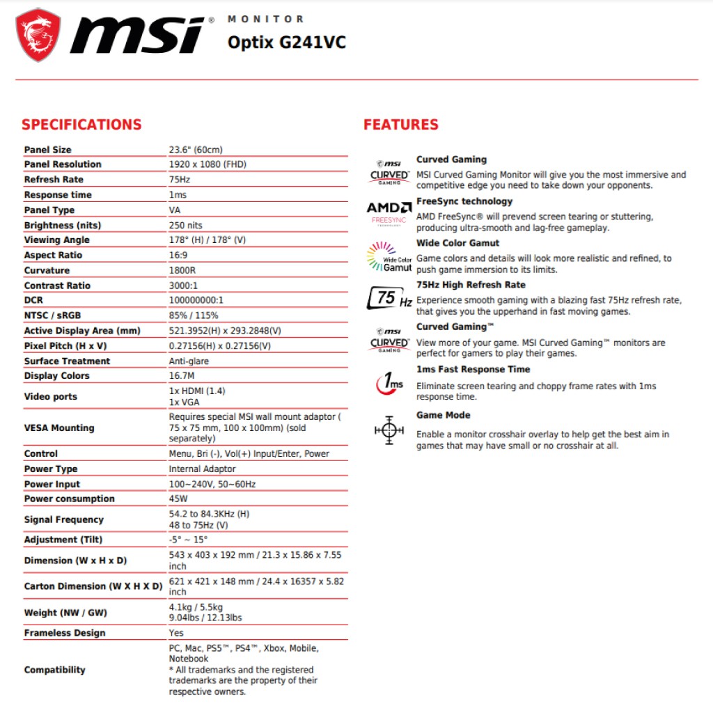 Monitor จอภาพ 23.6'' MSI Optix G241VC VA (VGA, HDMI) 75Hz CURVE FreeSync รับประกัน 3ปี