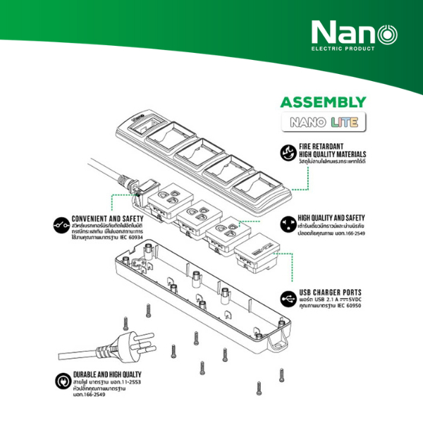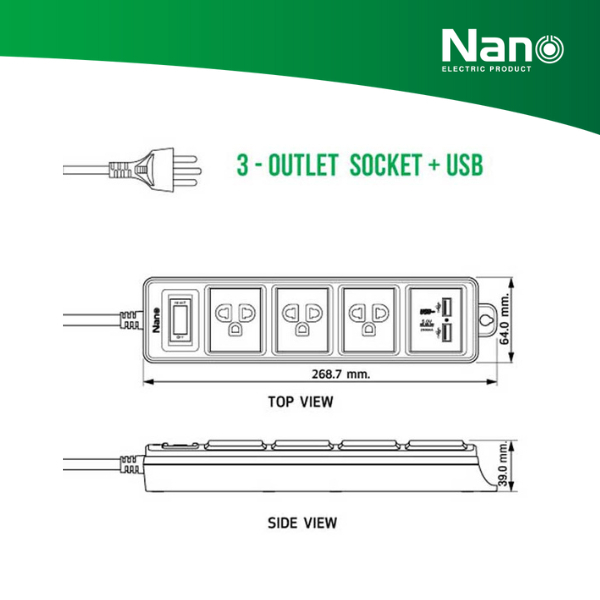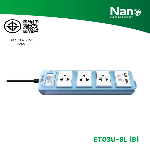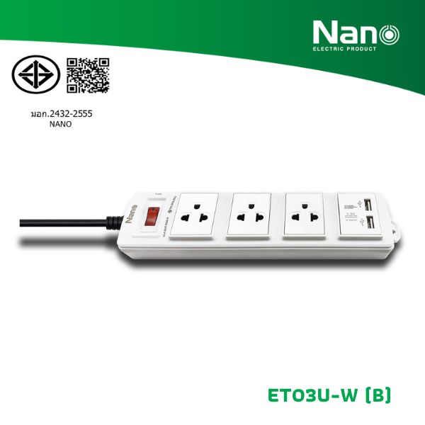 NANO Lite ปลั๊กพ่วง 3 เต้ารับ + USB 2.1A 5V + 1 สวิตช์ (สายดำ 3 เมตร) (1 ชิ้น/กล่อง) รุ่น ET03U-3M(B)