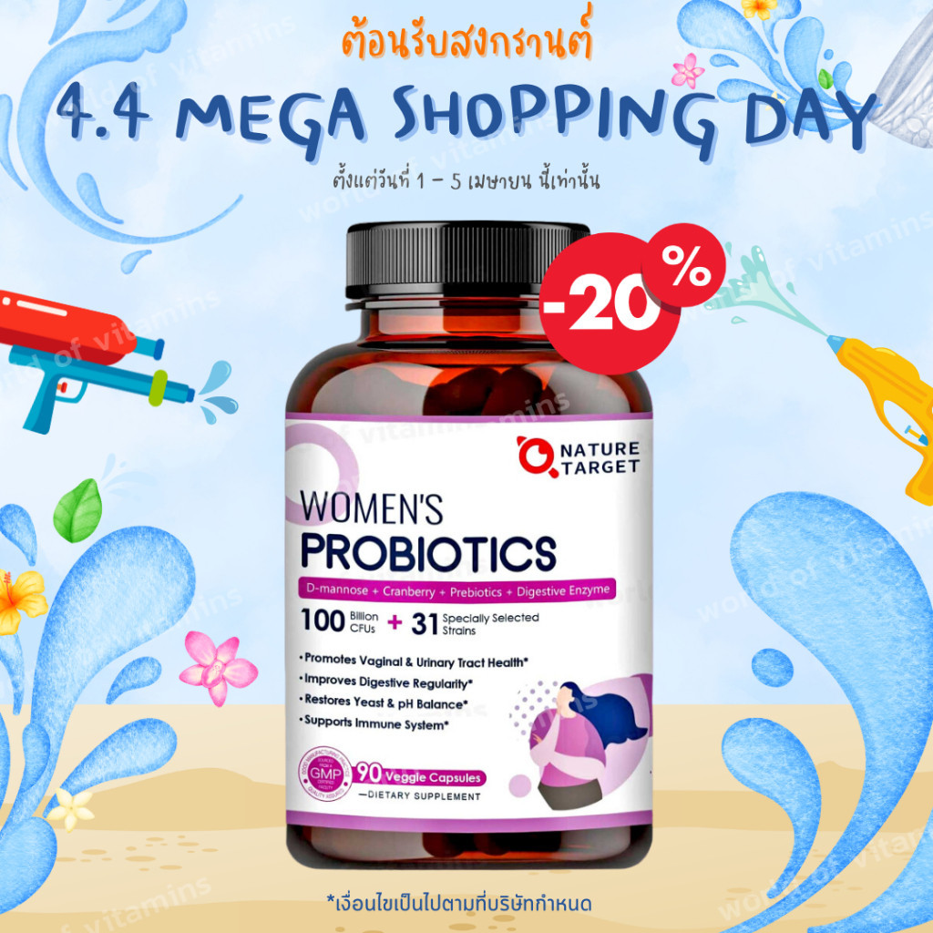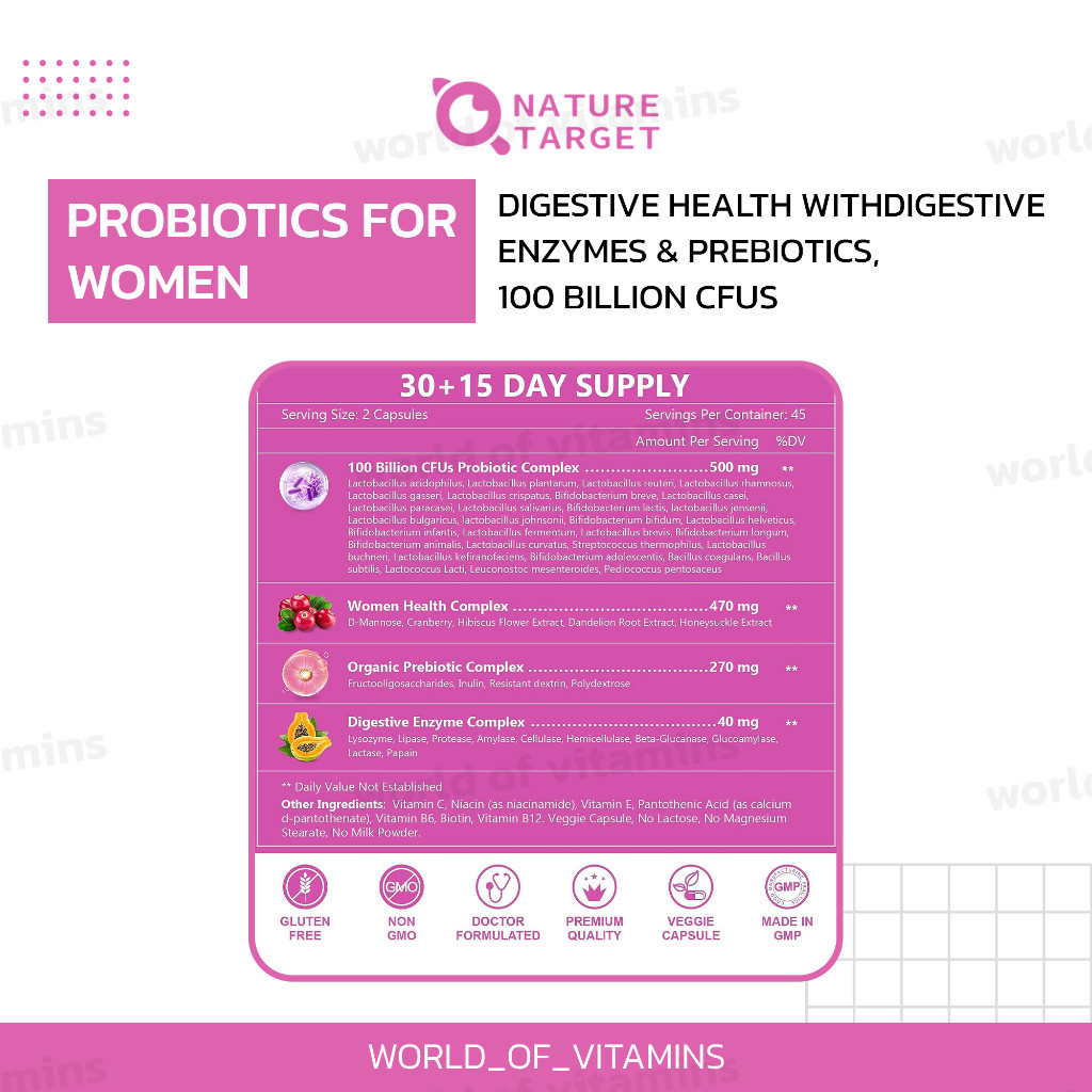 NATURE TARGET โปรไบโอติกสำหรับผู้หญิง 100 พันล้าน CFUs + เอนไซม์และพรีไบโอติก , 90 Vegcaps (Sku.2267)