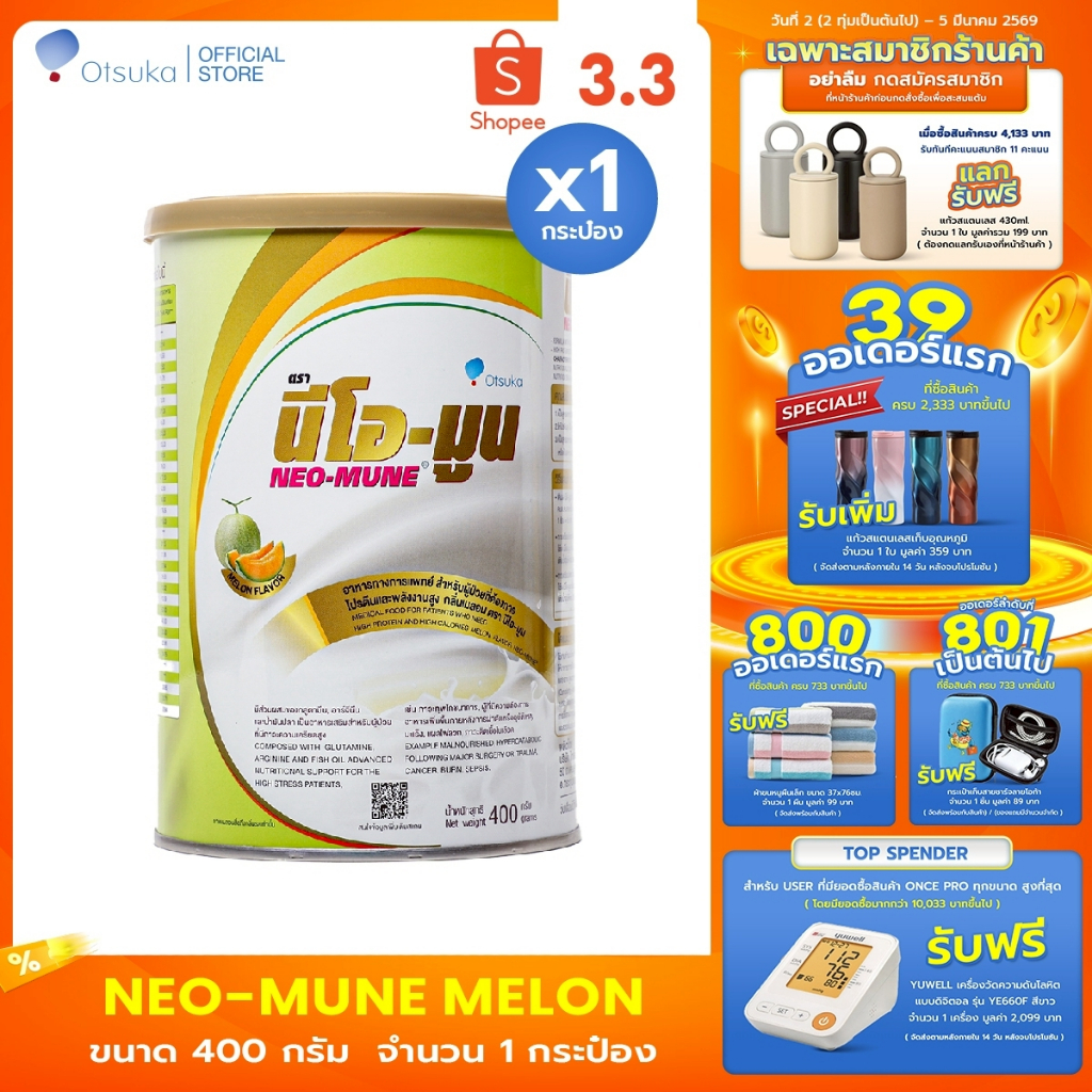 NEO-MUNE Melon Flavor 400 g. นีโอ-มูน กล ิ่นเมล่อน 400 g.อาหารชนิดผงสำหรับผู้ต้องการโปรตีนและพลังงานสูง จำนวน 1 กระป๋อง