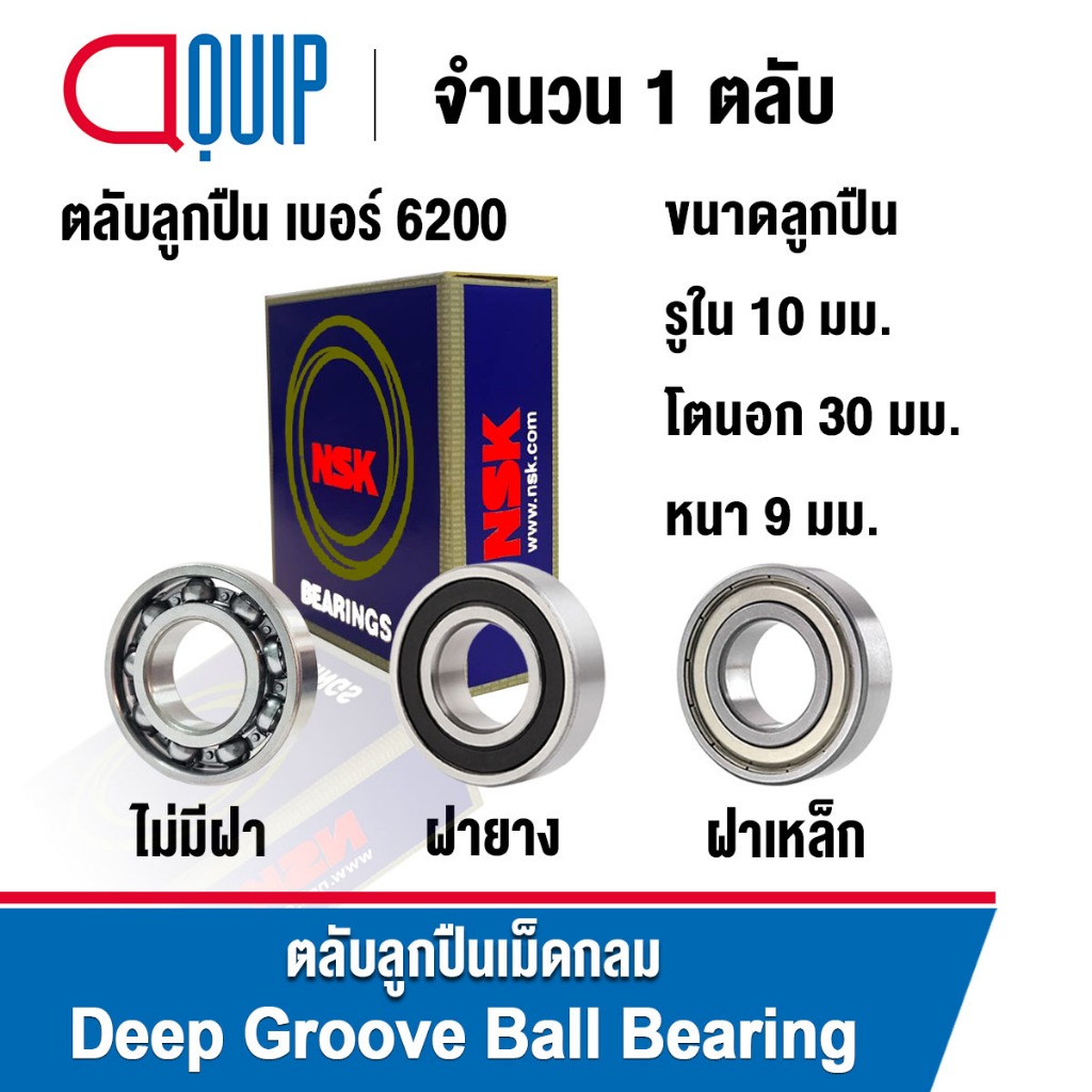 NSK ตลับลูกปืน เม็ดกลม 6200 (แบบไม่มีฝา) 6200-2RS (ฝายาง) 6200-2Z (ฝาเหล็ก) ขนาด 10x30x9 mm. 6200RS / 6200DD / 6200Z