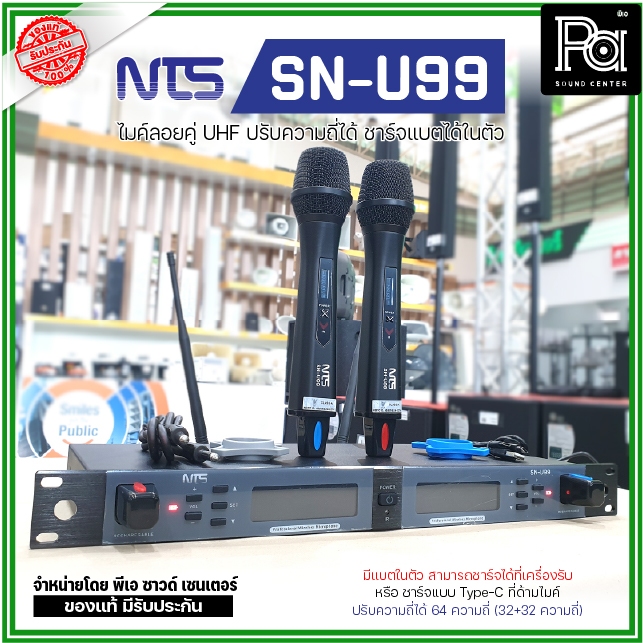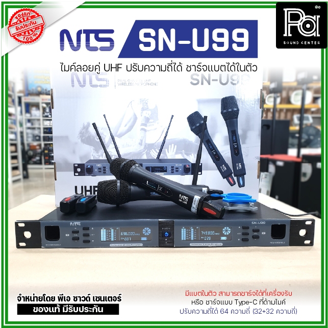 NTS SN-U99 ไมค์ลอยคู่ UHF ปรับความถี่ได้ 64 ชาแนล มีแบตเตอรี่ ชาร์จได้ในตัว ไมค์ไร้สาย รุ่น SN-U99