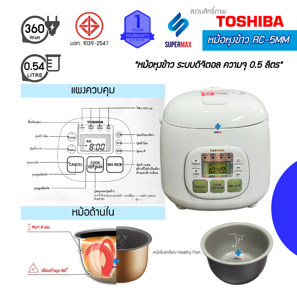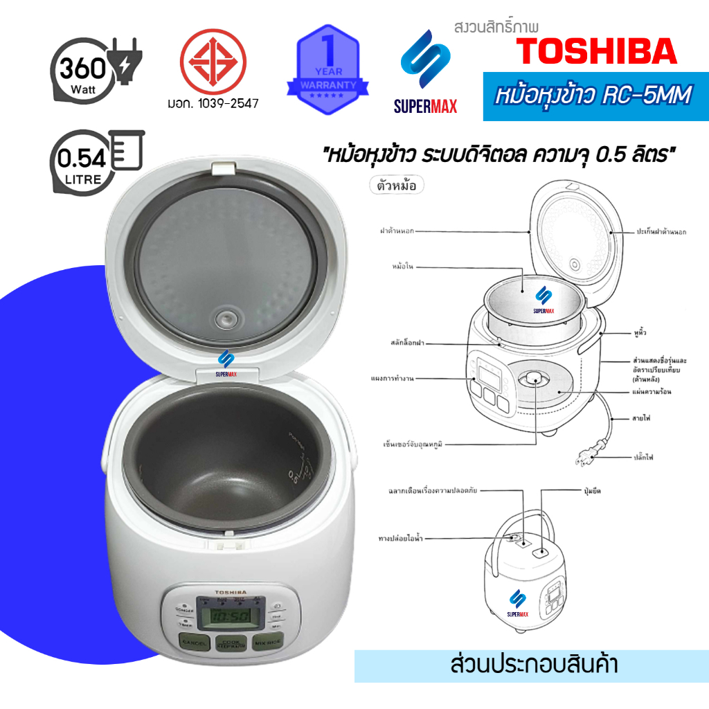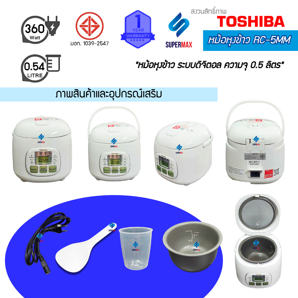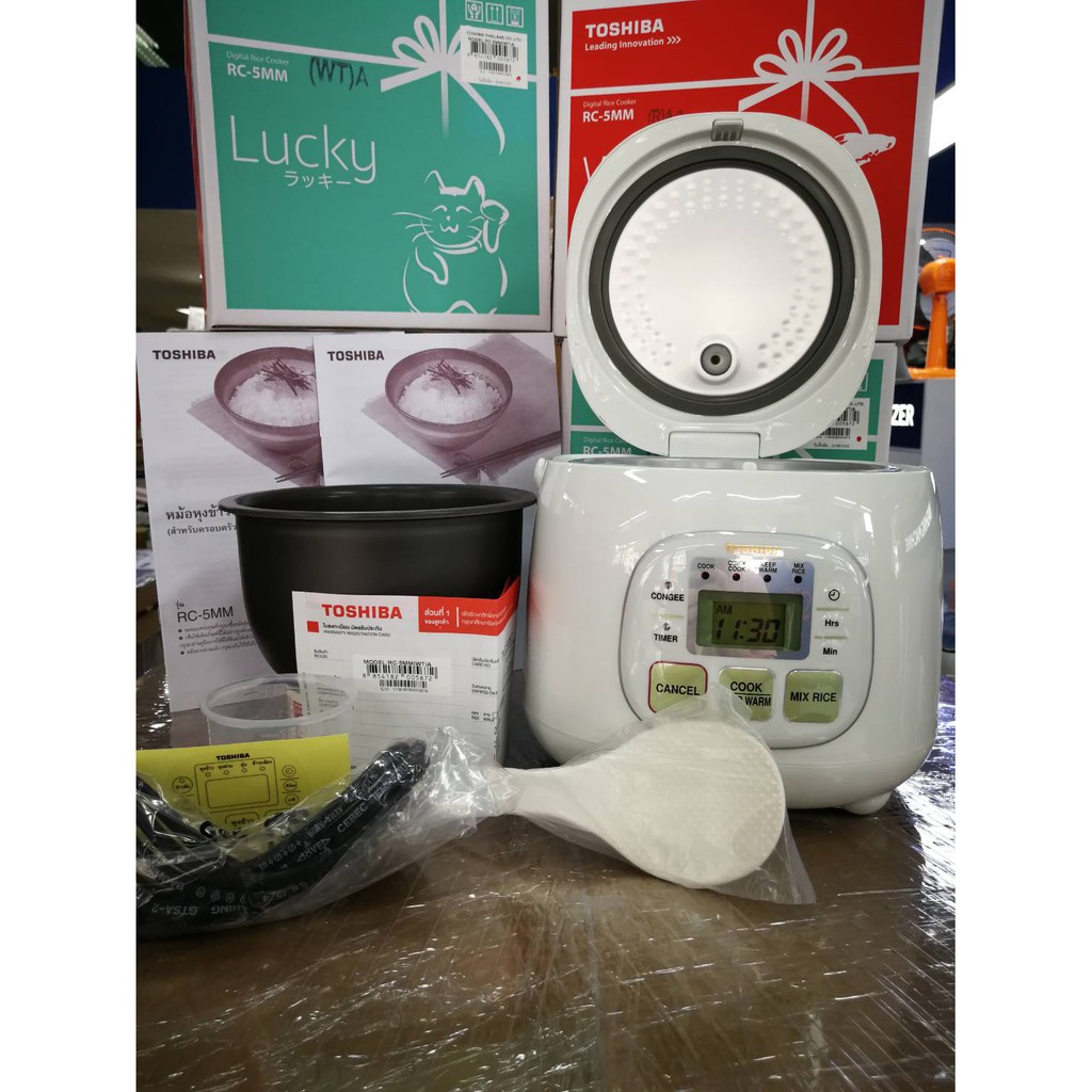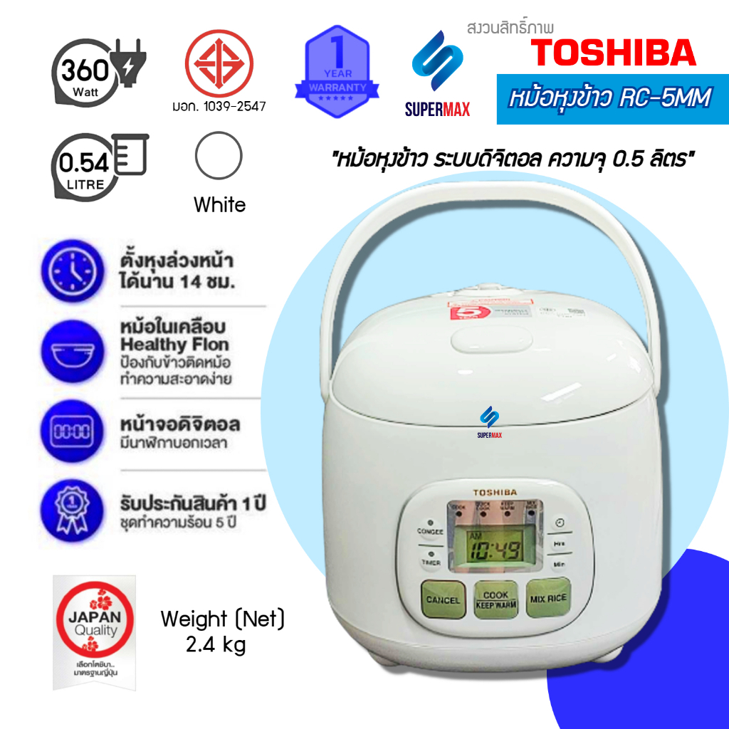 TOSHIBA หม้อหุงข้าว 0.54 ลิตร รุ่น RC-5MM(WT)Aสี ขาว หม้อในเคลือบสาร Healthy Flon รับประกันสินค้า 1ปี