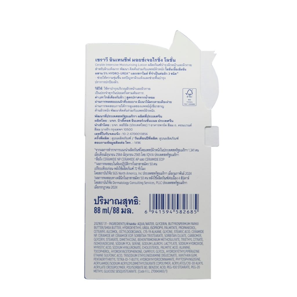 CERAVE Intensive Moisturising Lotion 88ml. เซราวี อินเทนซีฟ มอยซ์เจอไรซิ่ง โลชั่น บำรุงผิวหน้าและผิวกาย สำหรับผิวแห้งมาก