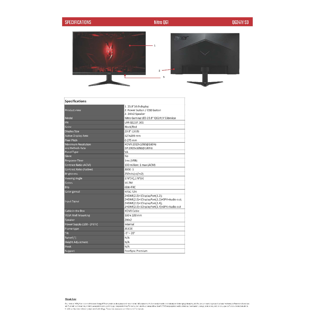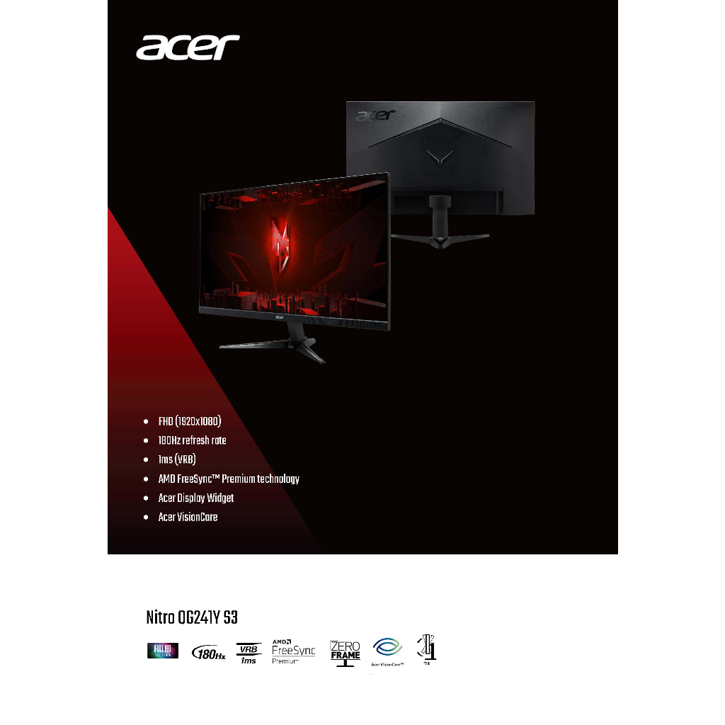 ACER Monitor รุ่น QG241YS3bmiipx 23.8" VA (1080p,HDMI,DP,SPK) / 1MS/ 180Hz/ sRGB 72% ประกันศูนย์เอเซอร์ 3 ปี