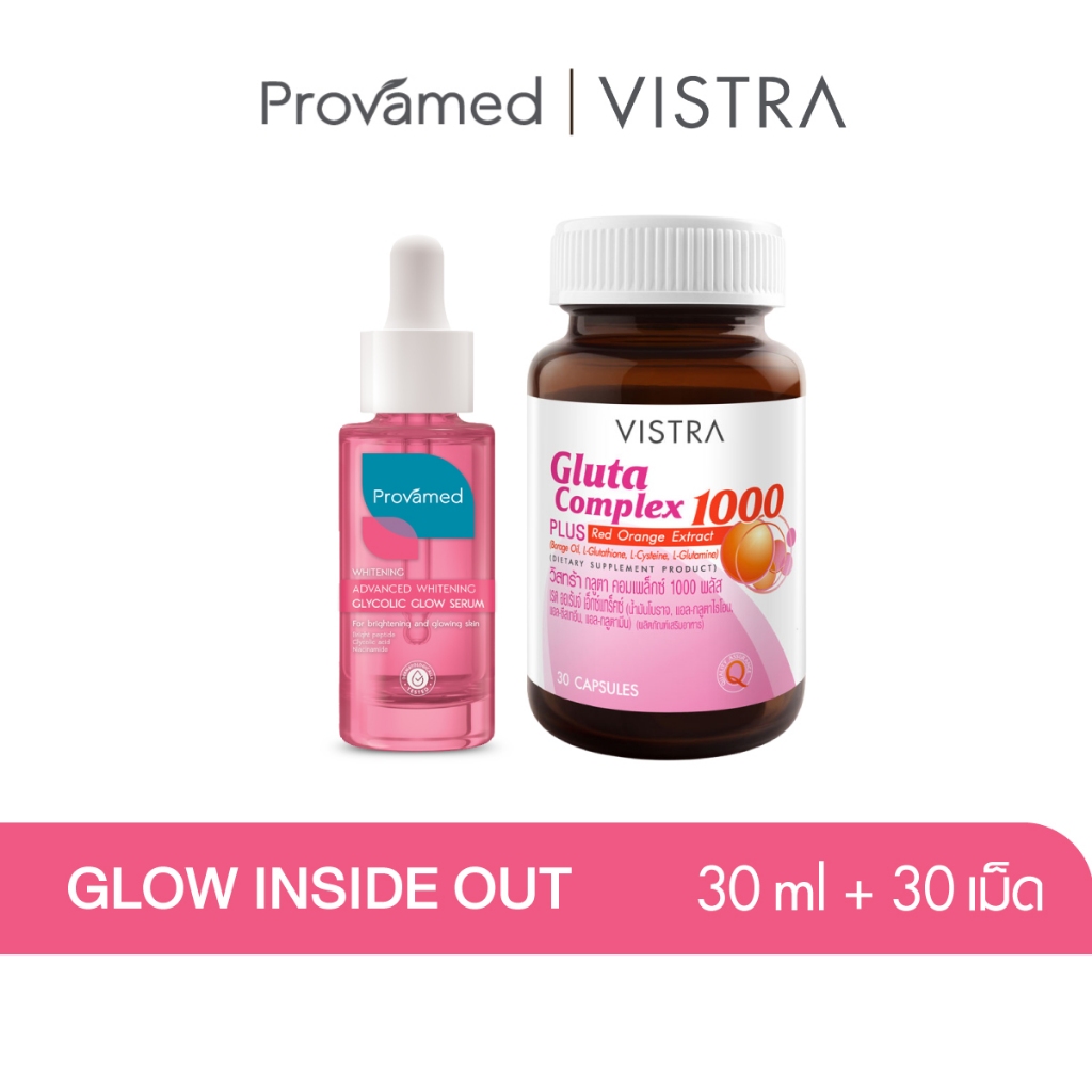 Glow inside out : PROVAMED ADVANCED WHITENING GLYCOLIC GLOW SERUM + VISTRA GLUTA COMLPEX 1000 PLUS RED ORANGE EXTRACT