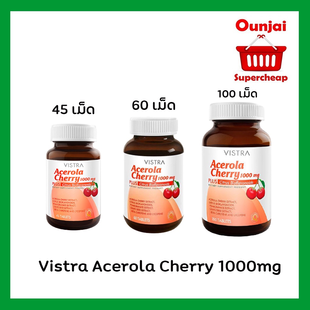 Vistra Acerola Cherry 1000 MG วิสทร้า อะเซโรลาเชอร์รี่ ขนาดบรรจุ 45, 60 และ 100 เม็ด [[ทุกขนาด]]