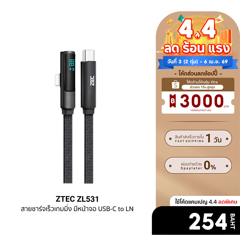[ลดเหลือ 254] ZTEC ZL531 สายชาร์จเร็วเกมมิ่ง มีหน้าจอ USB-C to LN 27W รองรับชาร์จเร็ว PD ยาว 1.2 เมตร -24M