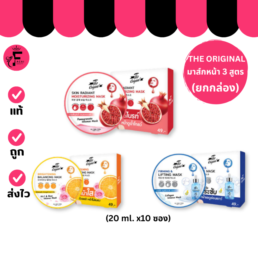 (กล่อง 10 ซอง) The Original Mask แผ่นมาส์กหน้า 3 สูตร มาส์กคอลลาเจน,ทับทิม,วิตซี (ปริมาณ 20 ml.)