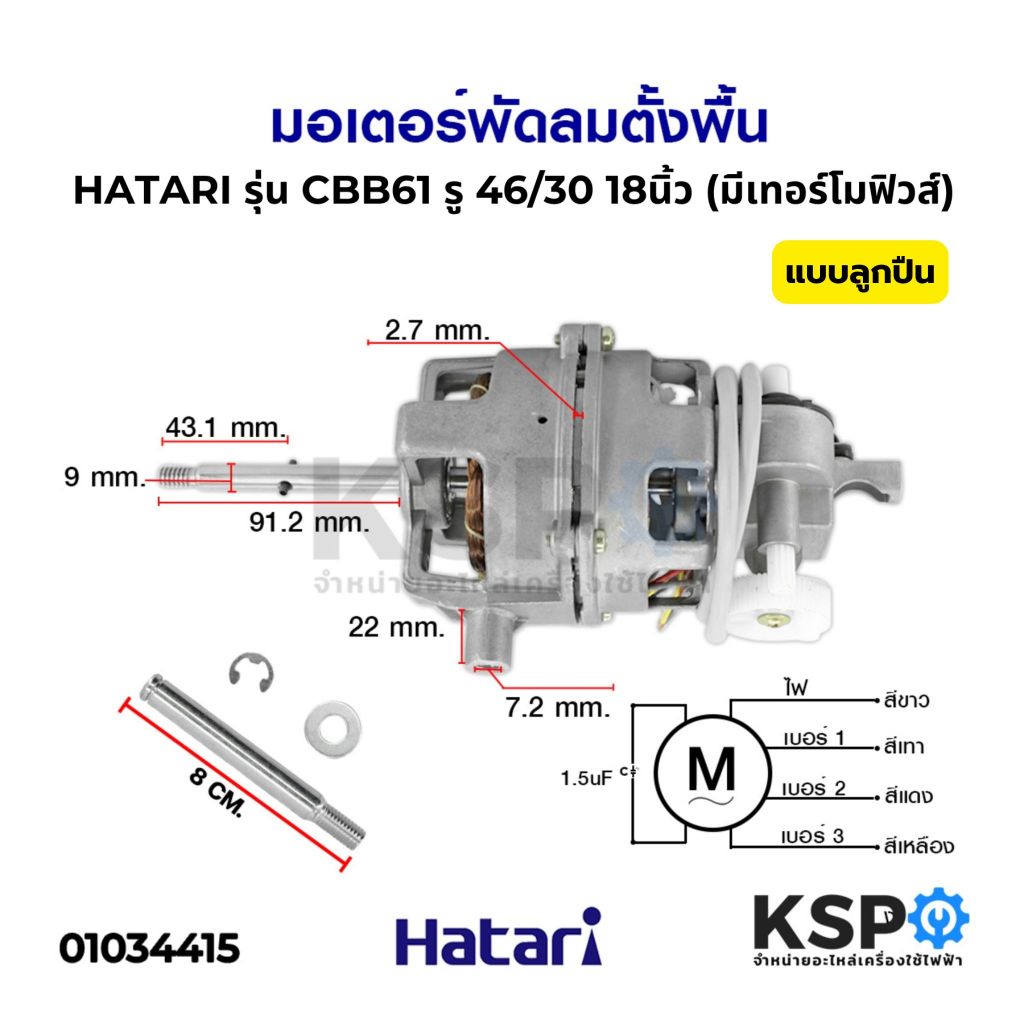 มอเตอร์พัดลม ตั้งพื้น 18 นิ้ว HATARI ฮาตาริ รุ่น CBB61 SH รู 46/30 แกน 9mm มีเทอร์โมฟิวส์ แบบลูกปืน (แท้) อะไหล่พัดลม