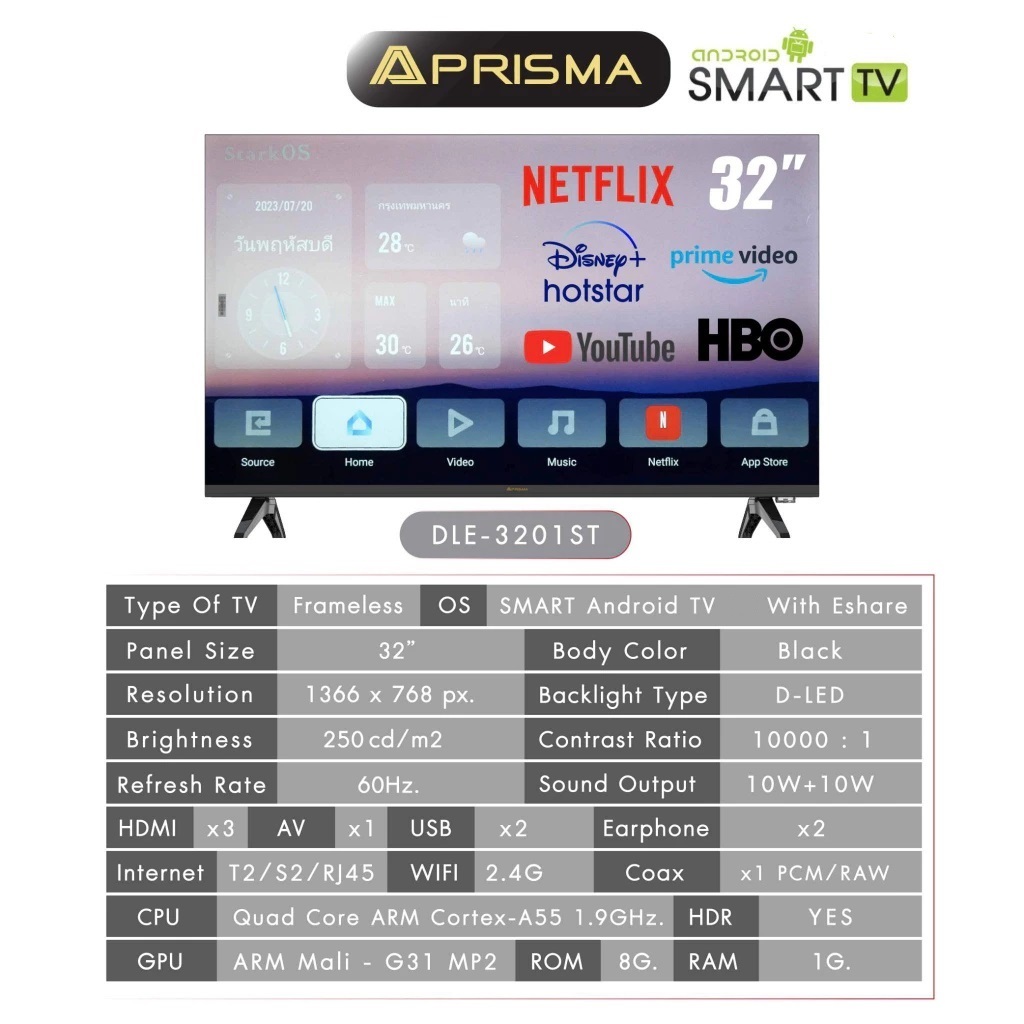 PRISMA 32 นิ้ว Smart TV HD Ready Android 14 จอFrameless ไร้ขอบ เล่นYoutube,Netflixได้ HDMI*3