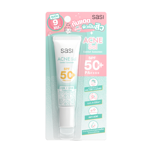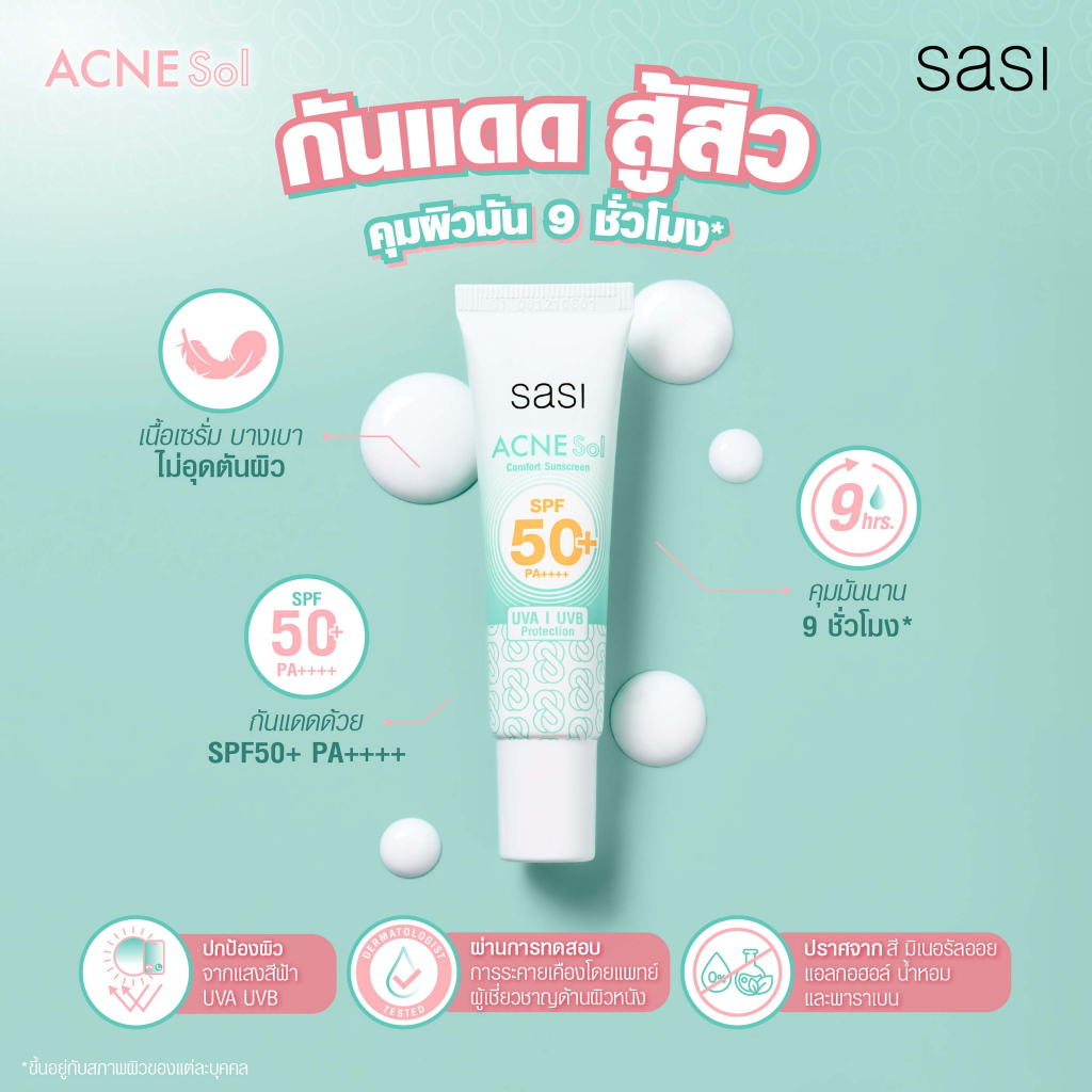 SASI Acne Sol Comfort Sunscreen SPF50+ PA++++ 15ml. ศศิ แอคเน่ โซล กันแดดเนื้อเซรั่ม สัมผัสบางเบา เหมาะสำหรับผิวเป็นสิว