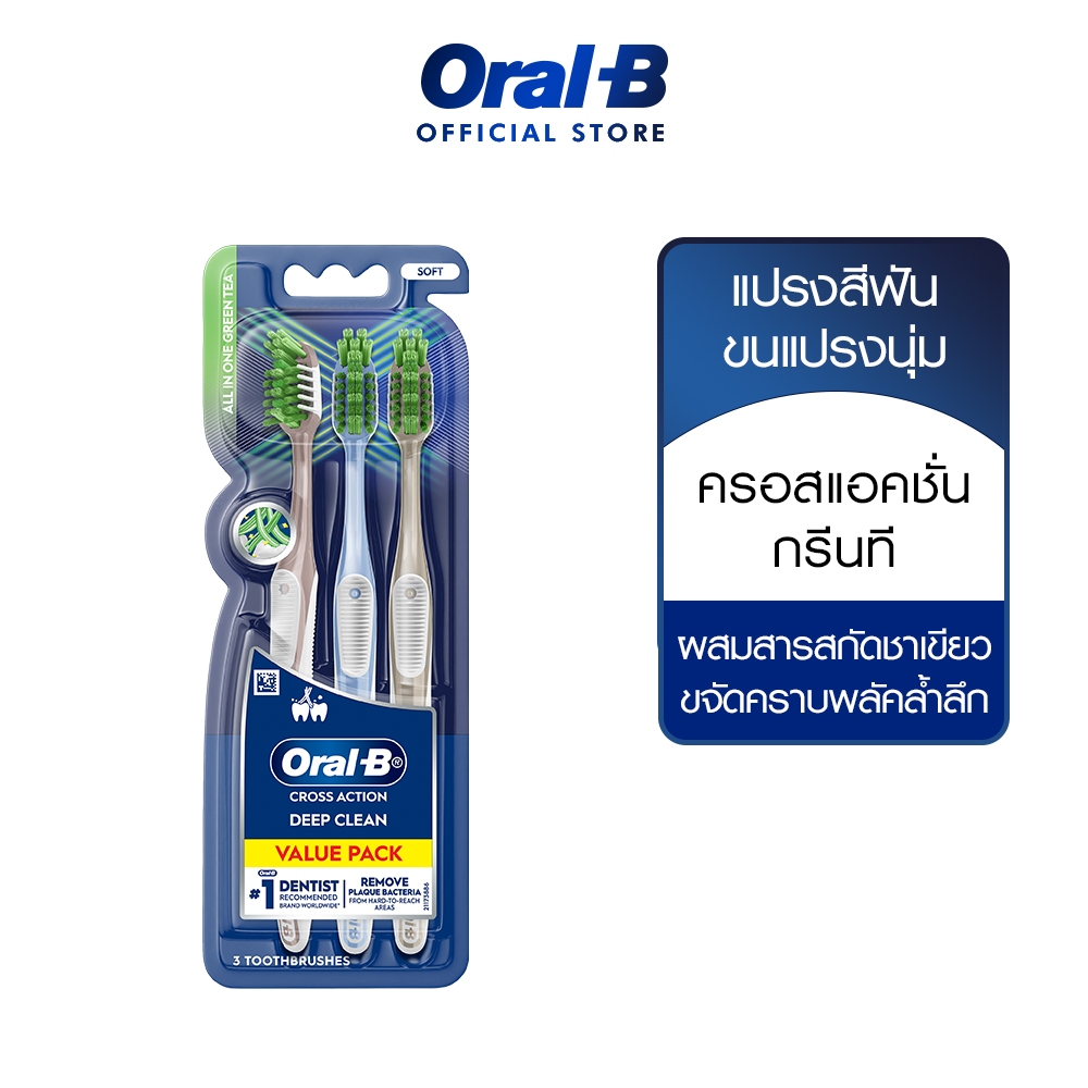 Oral-B ออรัลบี แปรงสีฟัน ครอสแอคชั่นกรีนที ขนแปรงไขว้ผสมสารสกัดจากชาเขียว 3 ด้าม Toothbrush Crossaction Green tea 3 Pack