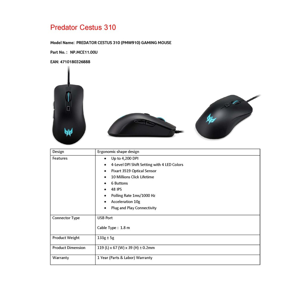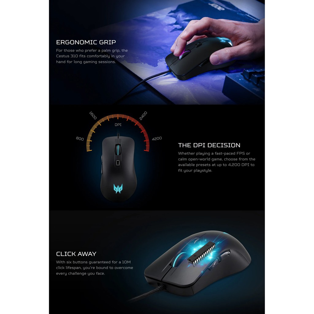 ACER Predator Cestus 310 Gaming Mouse (PMW910) with 4 LED (4200 DPI) ประกัน 1 ปี