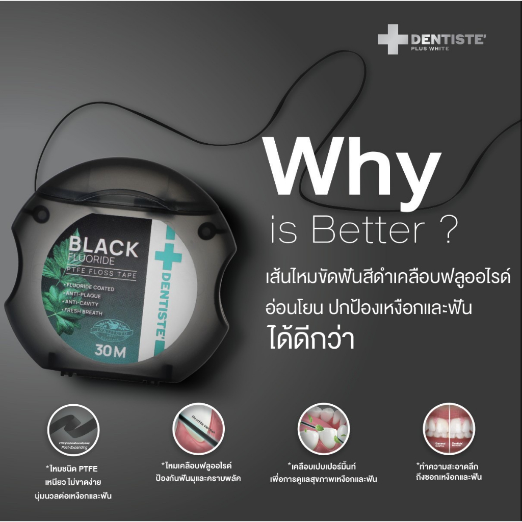 Dentiste Dental Black PTFE Floss Tape with Fluoride 30m ไหมขัดฟันเคลือบฟลูออไรด์ ขจัดคราบพลัค กลิ่นมิ้นท์