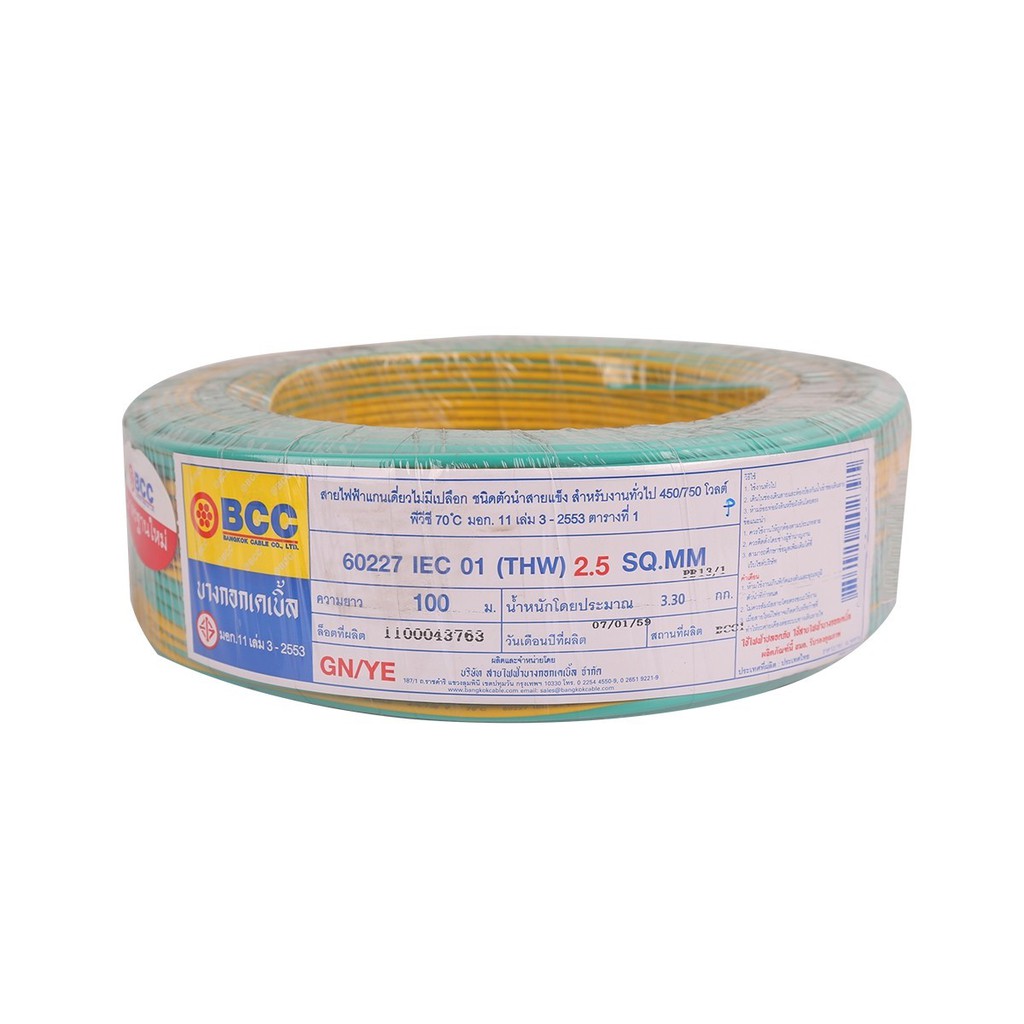 BCC สายไฟ IEC01 (THW) 1x2.5 Sqmm. ยาว 100 เมตร สีเขียว-เหลือง |ROL|