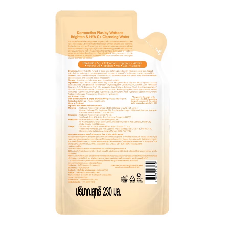 หมดอายุปี 28 | ใหม่ Dermaction Plus by Watsons Micellae Water Cleaning Refill 230 ml