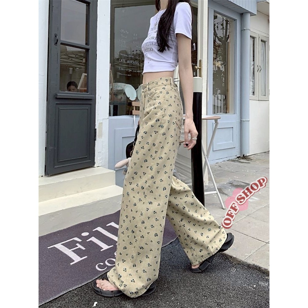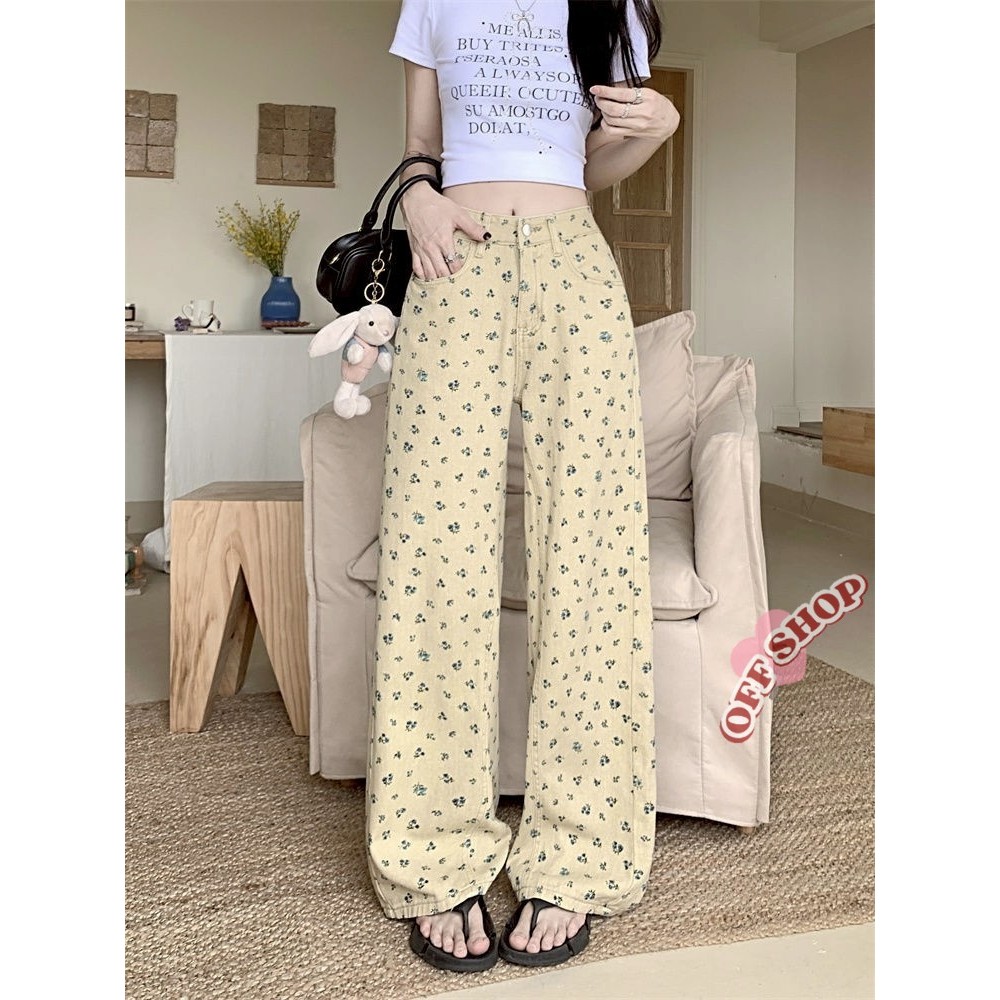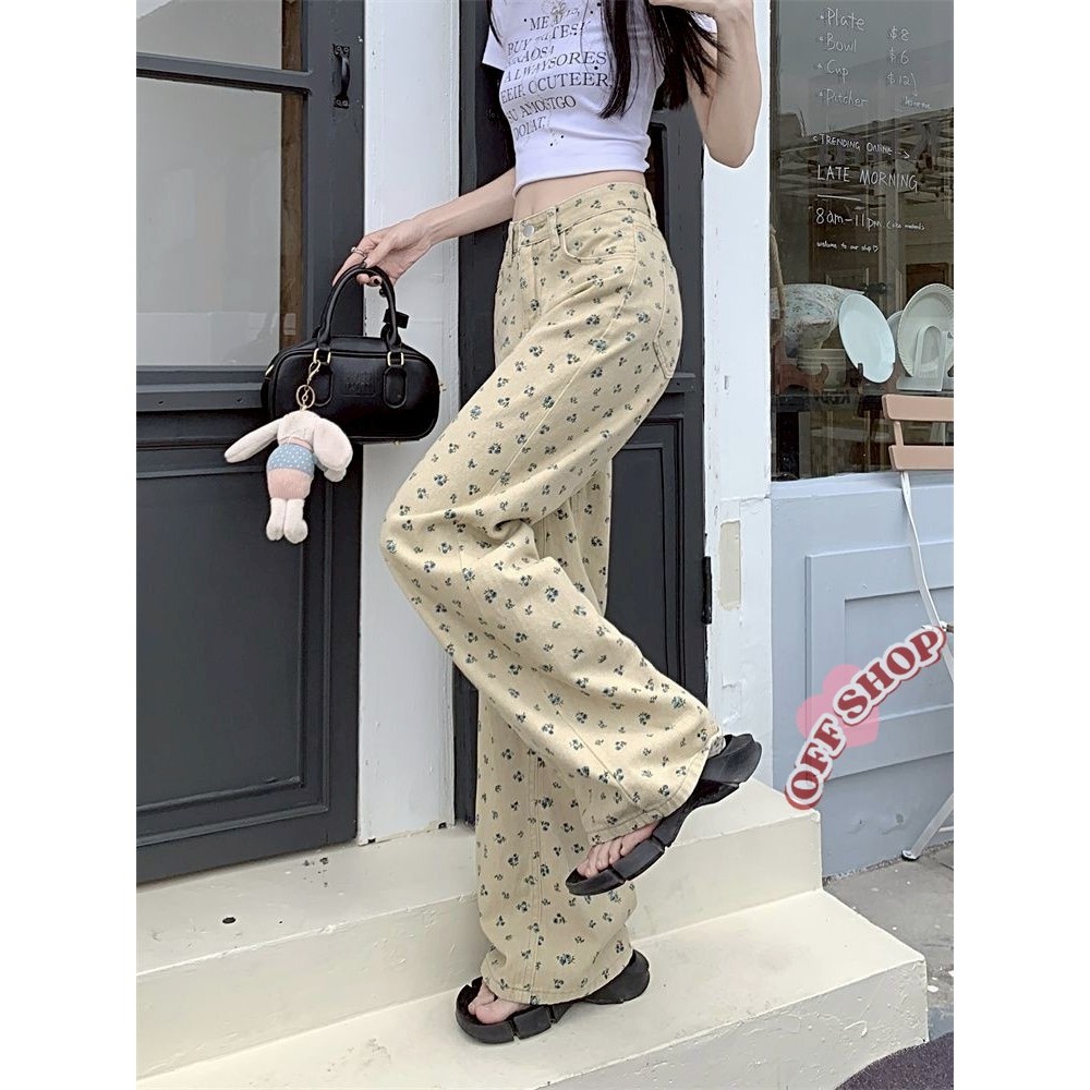 OFF SHOP 🥻ใหม่ 2025 กางเกงขายาว สีกากี เอวสูง ลายดอกไม้ ทรงพอดี"NZ1872