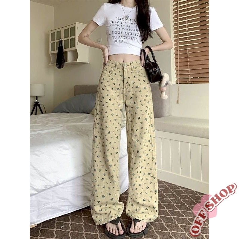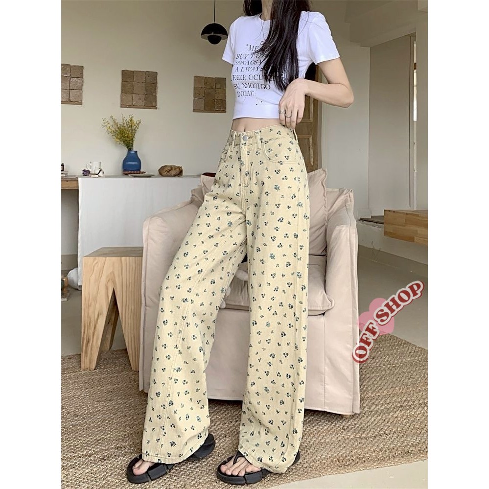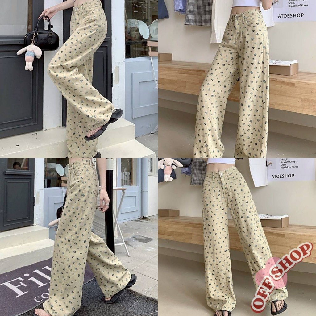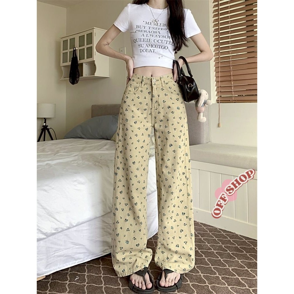 OFF SHOP 🥻ใหม่ 2025 กางเกงขายาว สีกากี เอวสูง ลายดอกไม้ ทรงพอดี"NZ1872