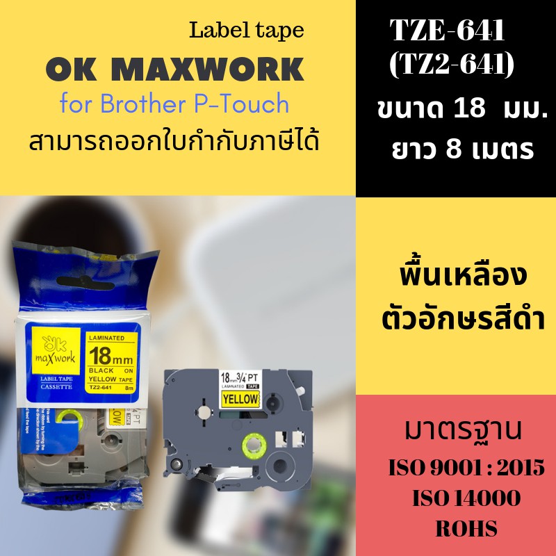 OK MAXWORK เทปพิมพ์อักษร 18 mm TZETZ2-641 พื้นสีเหลือง ตัวอักษรสีดำ