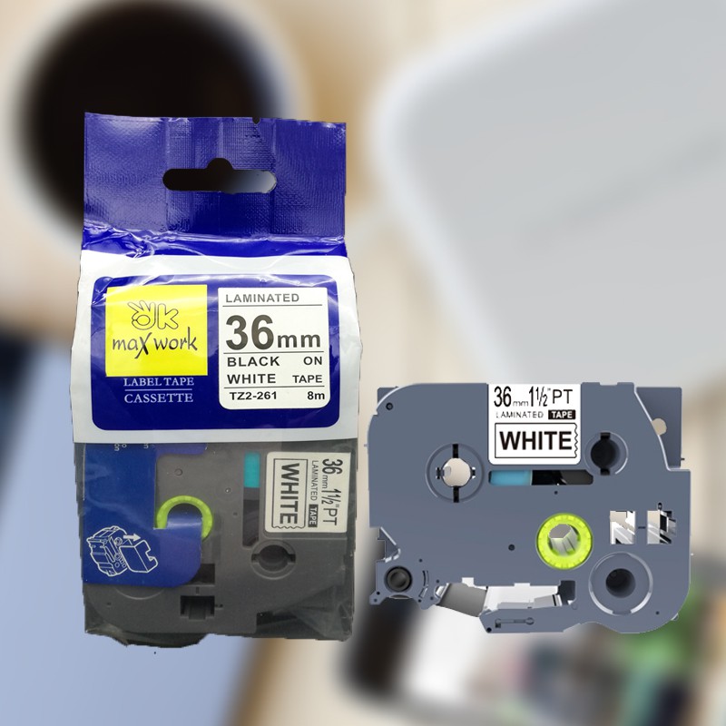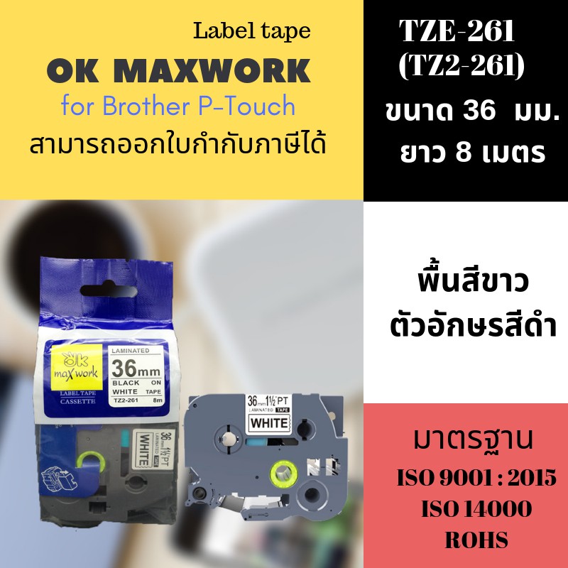 OK MAXWORK เทปพิมพ์อักษร 36 mm TZETZ2-261 พื้นสีขาว ตัวอักษรสีดำ