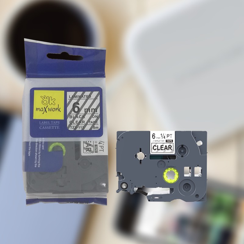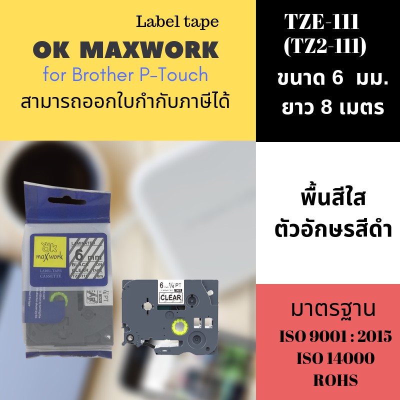 OK MAXWORK เทปพิมพ์อักษร 6 mm TZETZ2-111 พื้นสีใส ตัวอักษรสีดำ