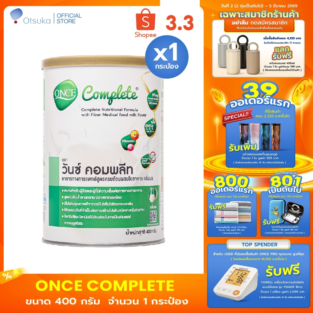 ONCE Complete Milk Flavor 400 g. วันซ์ คอมพลีท กลิ่นนม 400 g. อาหารชนิดผง ชง ดื่ม ผสมใยอาหาร จำนวน 1 กระป๋อง